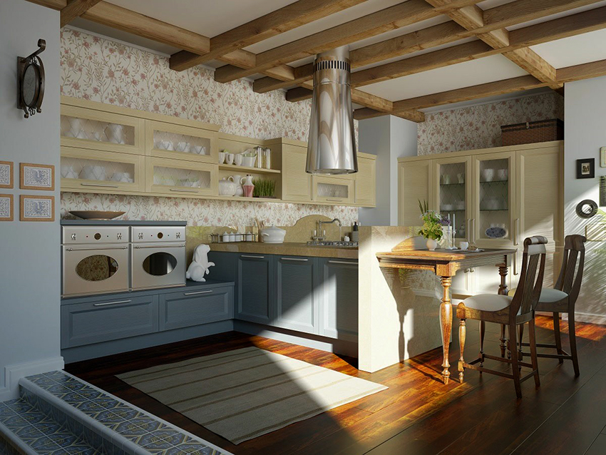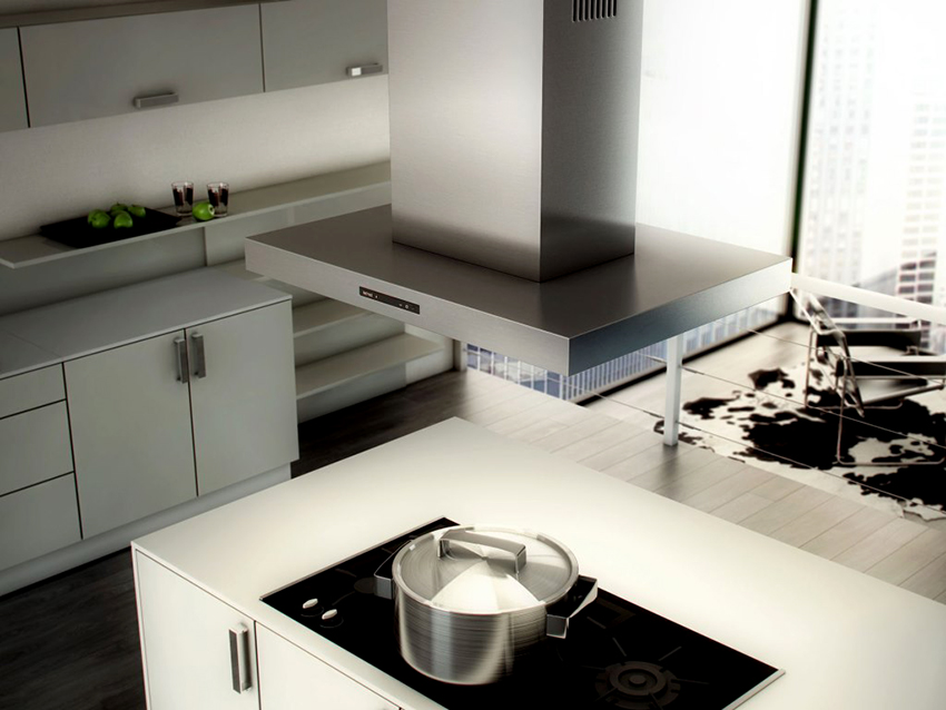 Hindi madaling mag-install ng isang hinged hood sa isang maliit na puwang, ang katawan na kung saan ay isang parisukat na tubo na nagtatapos sa isang patag na hugis-parihaba na payong. Gamit ang maliit na sukat ng silid, ang gumaganang ibabaw ng isla ay karaniwang ginawang makitid. Ang hood ay lilitaw na nakausli lampas sa mesa, kahit na ito ay antas o bahagyang mas mababa. Ang pagkakalagay na ito ay hindi lumilikha ng mga pisikal na hadlang, ngunit nagdudulot ito ng pakiramdam ng kakulangan sa ginhawa.