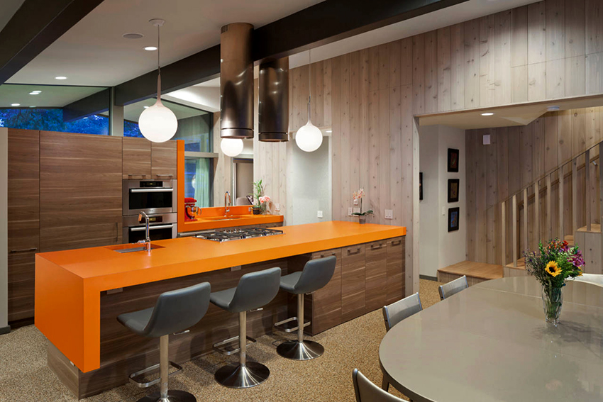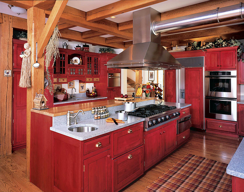 Sa pamamagitan ng isang simboryo at isang bilog na tubo, ang cooker hood ay perpektong makadagdag sa bahagi ng isla ng kusina. Ang komposisyon na ito ay nagpapalambot sa kalakhan, lumilikha ng ginhawa at ginhawa. At ang pagkakaroon ng mga anggulo at tuwid na mga linya ay magdaragdag ng sukat sa interior, isang pakiramdam ng pagiging solid, pagiging maaasahan.
