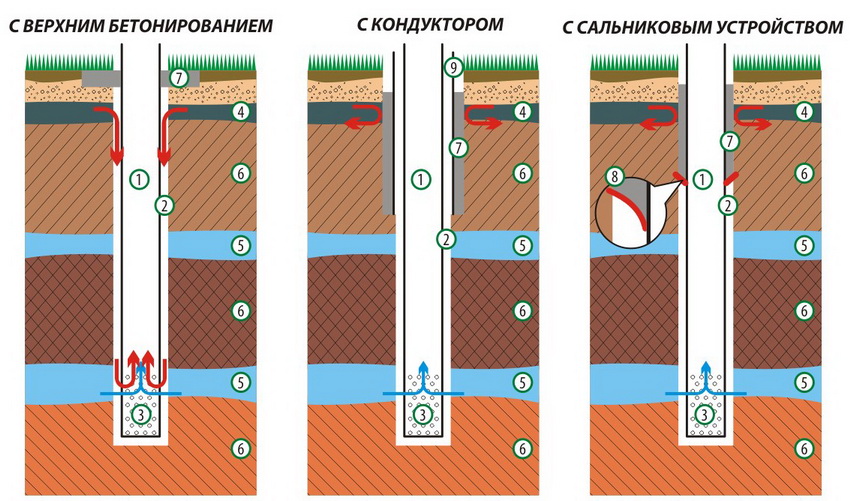 Mga pagpipilian sa pagpapatupad ng maayos. 1-production casing, 2- annular space, 3 - filter na bahagi ng pambalot, 4 - "top water", 5 - aquifers, 6 - hindi natatagusan na strata (siksik na clays), 7 - pagpuno ng semento, 8 - kahon ng palaman, 9 - bulag na bakal haligi (conductor)