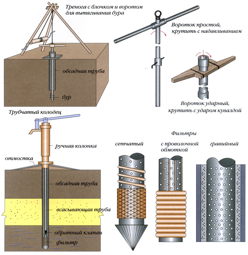 Kung ang aquifer ay matatagpuan medyo mababaw, humigit-kumulang sa lalim na 30-50 metro, pagkatapos ay maaari mong subukang mag-drill ng isang tubig na rin mismo. Upang gawin ito, kinakailangan upang bumuo ng isang pag-install na binubuo ng isang drill, isang tripod kung saan ito ay nasuspinde, isang winch at isang mabibigat na "babae". Maaari mo ring gamitin ang hydrodrilling na pamamaraan. Sa kasong ito, ang bato ay patuloy na hugasan ng tubig.