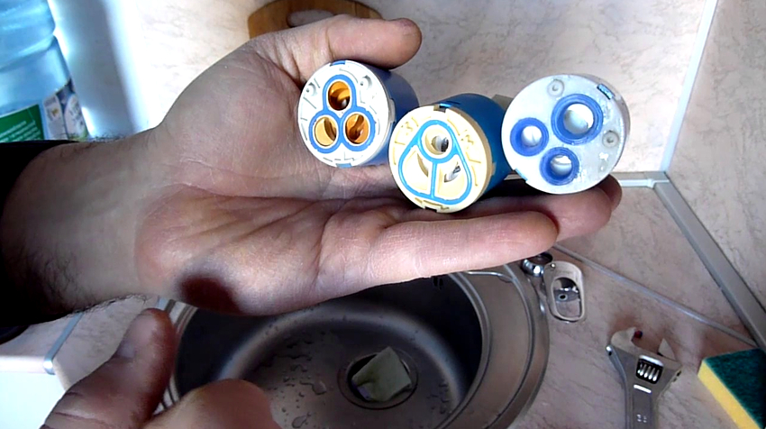 Depende sa materyal ng paggawa ng panloob na pagsasara, may mga mekanismo ng pag-lock ng ceramic at metal. Ang ceramic cartridge para sa faucet ay isang simpleng disenyo na may dalawa o tatlong plate bilang pangunahing elemento. Ang mga ceramic disc na ito ay magkakasya na magkasya laban sa bawat isa, na nagbibigay, dahil sa pagkakaroon ng tatlong butas, regulasyon ng tindi ng daloy ng tubig at ng temperatura nito. Ang mga cartridge na ito ay mas matibay, nailalarawan sa pamamagitan ng tahimik na operasyon, ang kakayahang maayos na ayusin ang presyon ng tubig.