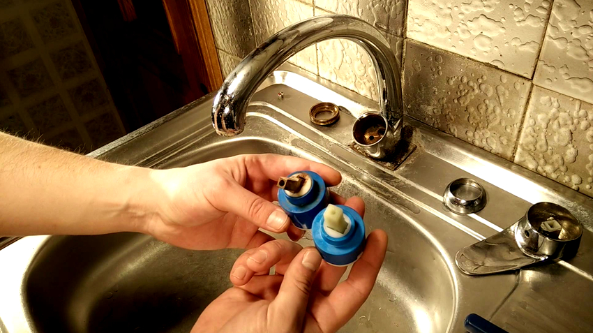 Ngayon ay maaari mong alisin ang cartridge mismo at siyasatin ito. Para sa mga ito, ang mga pagkilos na banayad na swinging ay ginaganap sa elemento sa paitaas at patagilid na direksyon. Kung natagpuan ang mga bitak, chips o iba pang nakikitang pinsala, dapat itong mapalitan ng isang bagong aparato.