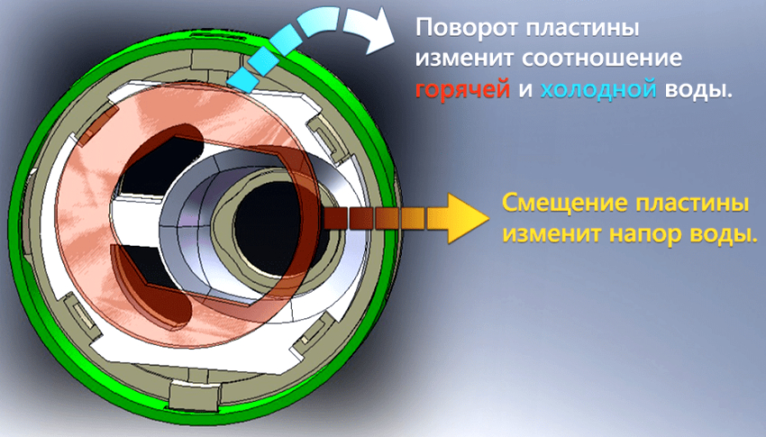 Mayroong isang espesyal na plato sa loob ng mekanismo, kung saan, kapag nakabukas, ay nagbibigay ng paghahalo ng malamig at mainit na daloy ng tubig. Sa kaso ng pag-aalis ng disc na ito, nangyayari ang isang pagbabago sa presyon. Sa ilang mga modelo ng kartutso, maaaring mai-install ang isang maliit na roller sa halip na mga plato. Kapag gumulong ang elemento, maaari nitong isara ang butas ng malamig o mainit na tubig. Ang tangkay ay isang extension ng hawakan ng balbula.