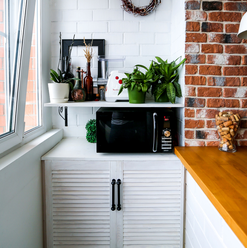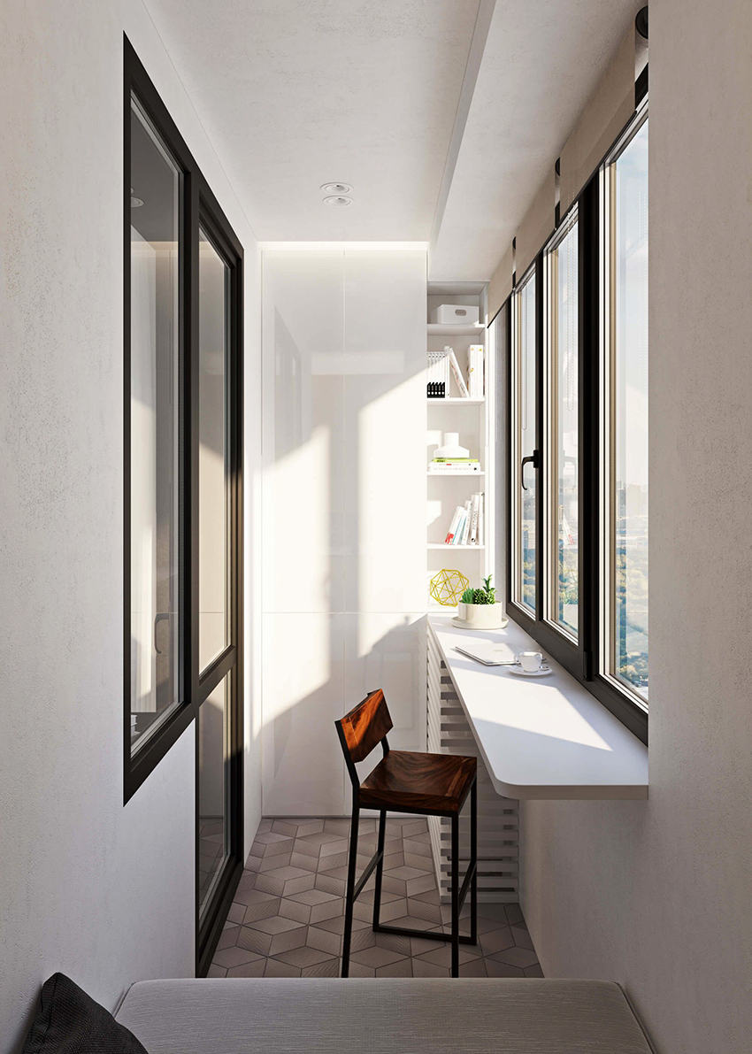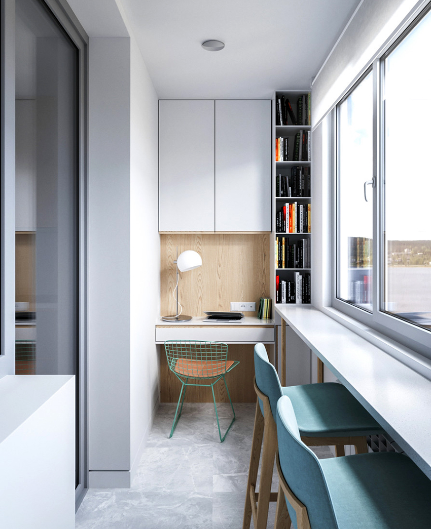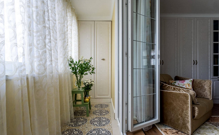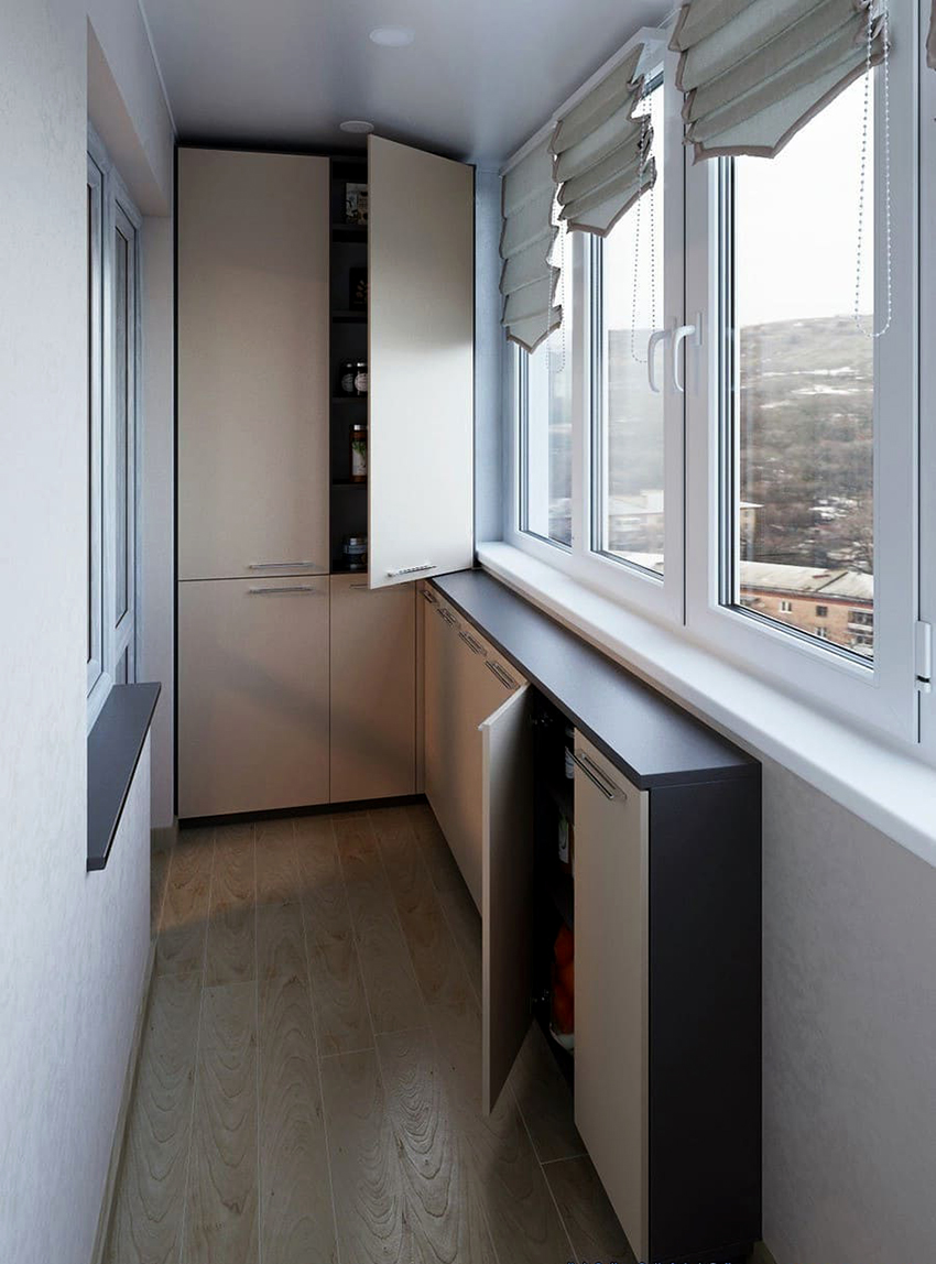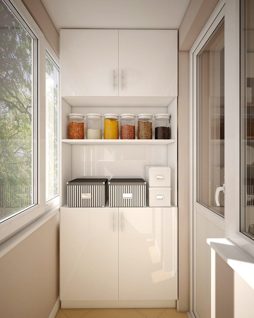 Balkon mutfağın devamı ise, kapılar mutfak cephelerinin tasarımına uygun buzlu cam eklerle tamamlanmaktadır. Bu durumda, iki bitişik odayı görsel olarak birbirine bağlamak mümkün olacaktır. Aynalı kapılarla donatılmış balkona kendi kendine yapılan bir gardırop takarak, odanın boyutunu görsel olarak büyütmek mümkün olacaktır. Balkonda farklı depolama türleri kurmanın avantajları: