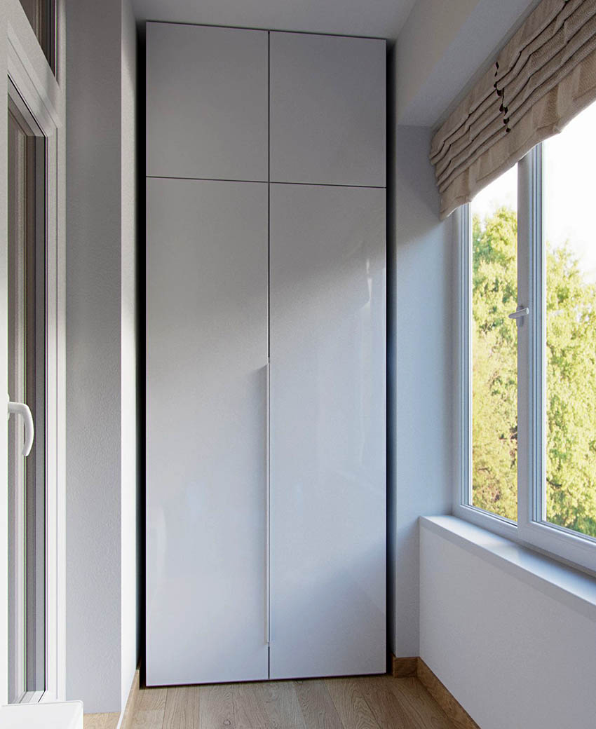 Önemli! Hangi dolap tasarımı seçilirse seçilsin, asıl önemli olan balkonun güvenilir bir şekilde yalıtılmasını sağlamaktır, böylece dışarıdaki hava koşullarından bağımsız olarak odadaki sıcaklık sabit kalır. Çerçeve malzemesinin ve kapıların yanmasını önlemek için pencerelerde panjurların varlığına da dikkat etmelisiniz.