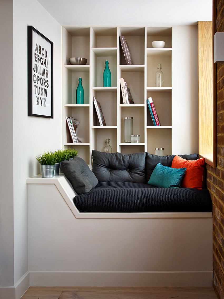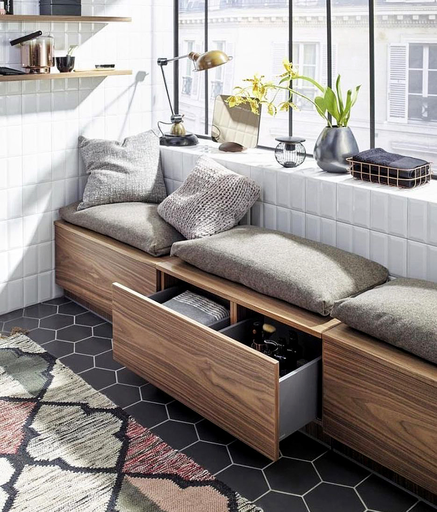 - Pencere pervazının altındaki tüm alanı kaplayan geniş bir komodin. Neredeyse görünmez, ama aynı zamanda çok geniş.