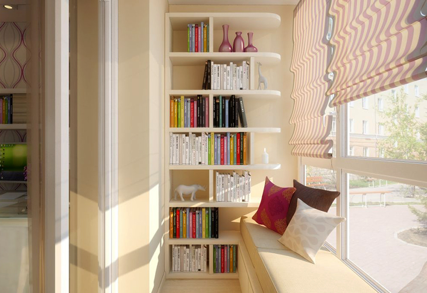 - Rafları açın. Hem boş duvarın tüm yüzeyine hem de sadece küçük bir oda boyutuna sahip üst kısmına yerleştirilebilirler, böylece balkonda kolayca hareket edebilirsiniz.