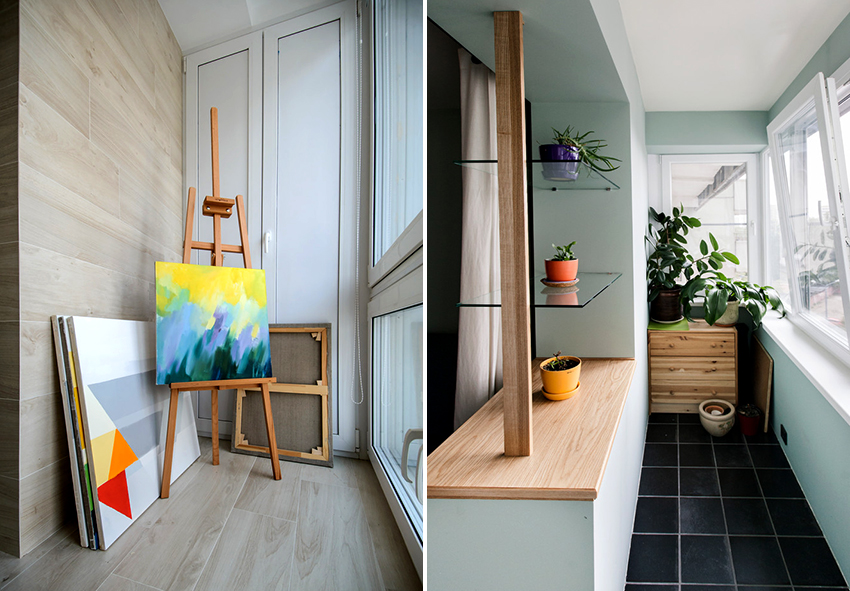 Alanı geniş bir gardıropla doldurmak istemiyorsanız, balkon için kendi dolaplarınızı yapmakla kendinizi sınırlayabilirsiniz. En uygun çözüm, bu tür mobilyaları, gerekirse artırılan pencere pervazlarından birinin altına yerleştirmektir. Ortaya çıkan masa üstü, bir çalışma masası olarak veya bitkileri düzenlemek için kullanılır. Balkonda bol miktarda ışık var, bu da burayı çiçek yetiştirmek için ideal bir yer yapıyor ve bordür taşı pencerelerin hiçbirini engellemiyor.