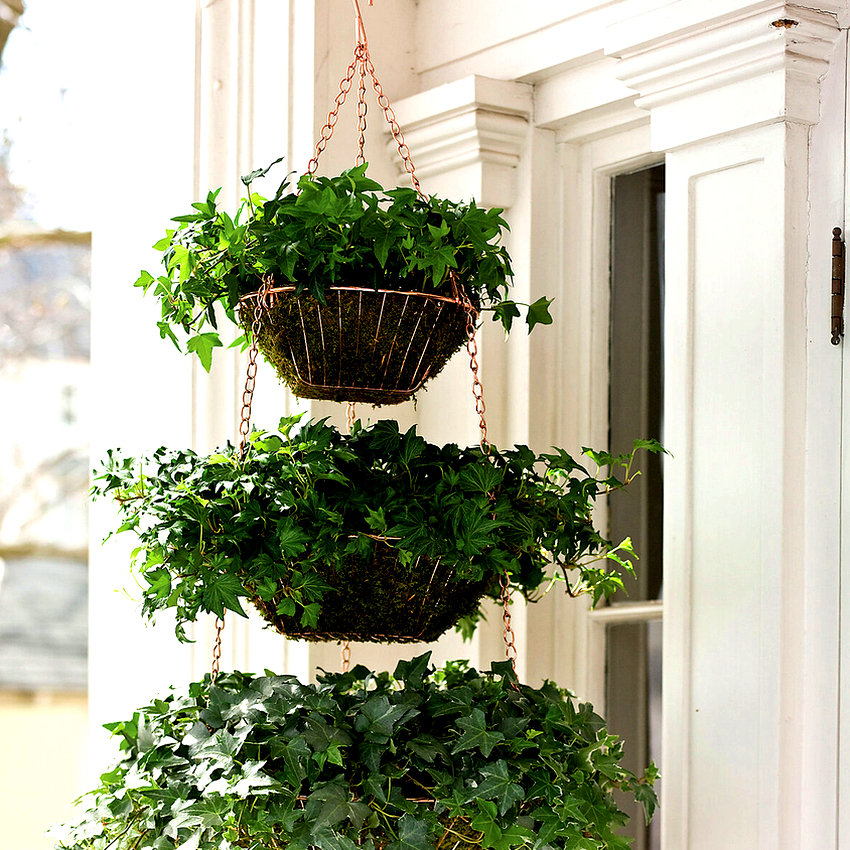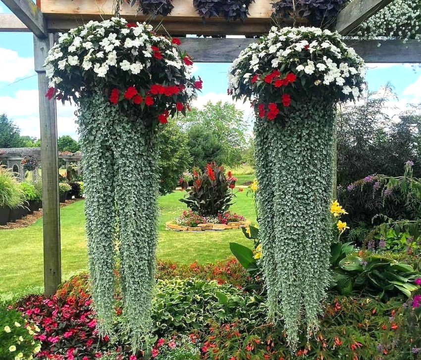 Sadece zemin kısmını değil, aynı zamanda sitenin üst katmanlarını da çiçeklerle süsleme arzusu asma saksı seçeneklerinin popülerliğine yol açmıştır. Bu pozisyonda saksılar için en uygun çiçekler asılır. İlginç bir dekoratif etki yaratan, akan çiçek kütlesidir.