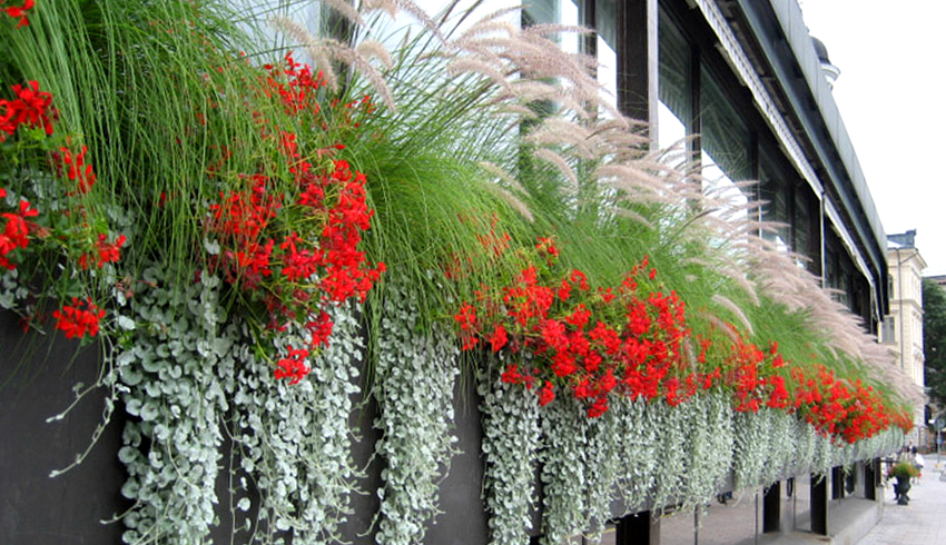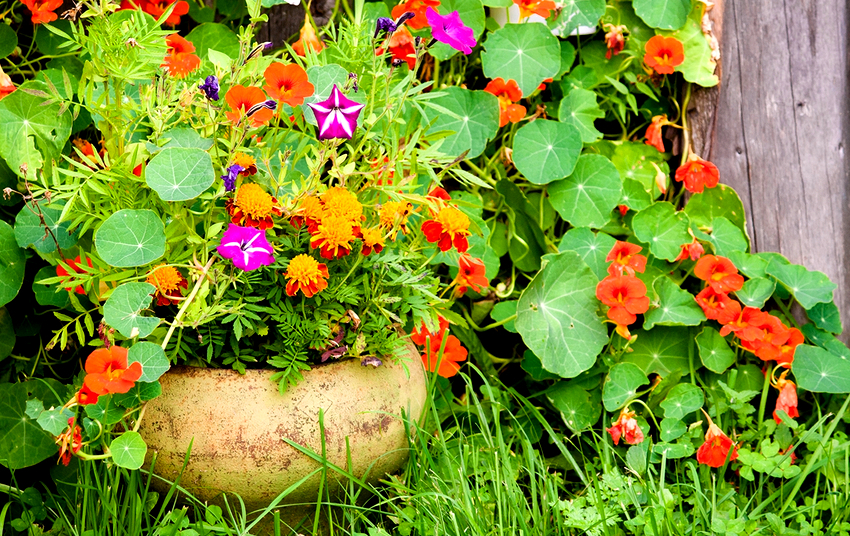 Peyzajın dekoratif bir unsuru olarak saksıda sokak çiçekleri