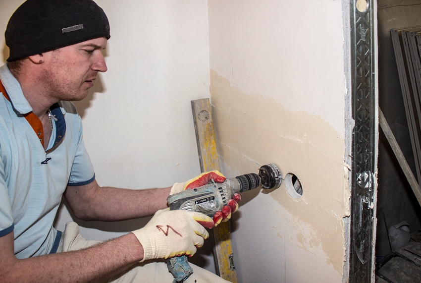 Để xác định tâm, trước tiên bạn cần dùng thước dây và bút chì để đánh dấu hình chữ thập trên tường. Sau đó, bạn cần phác thảo hình tròn được đề xuất, tạo bốn lỗ bằng mũi khoan ở giao điểm của hình tròn và các đường thẳng đánh dấu, cũng như ở trung tâm. Sau đó, bạn sẽ cần một máy cắt bê tông đặc biệt, đó là một chiếc mão.