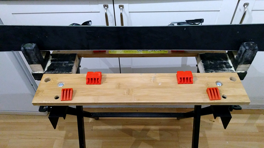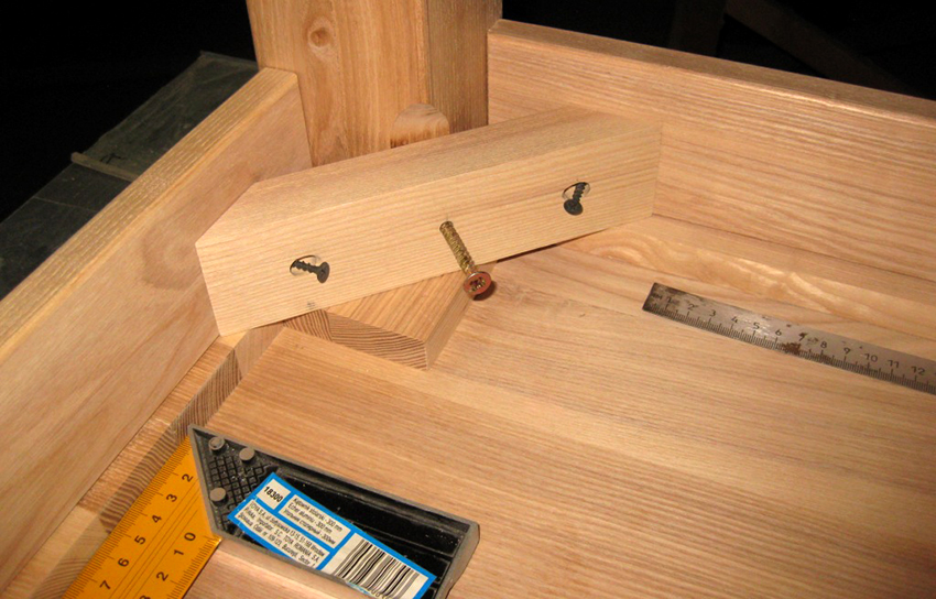 Sử dụng kẹp hoặc vít, bạn cần lắp các dải đỡ cho mặt bàn. Chúng sẽ được đặt tạm thời ở đây - chỉ để có thể căn chỉnh vị trí của mặt bàn và mặt phẳng của nó theo chiều ngang. Tiếp theo, ba lớp bìa được lắp ráp, được cố định bằng vít và keo dính. Sau đó, các thanh được loại bỏ và kết quả được kiểm tra. Mặt bàn nên xoay tự do.