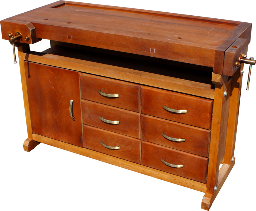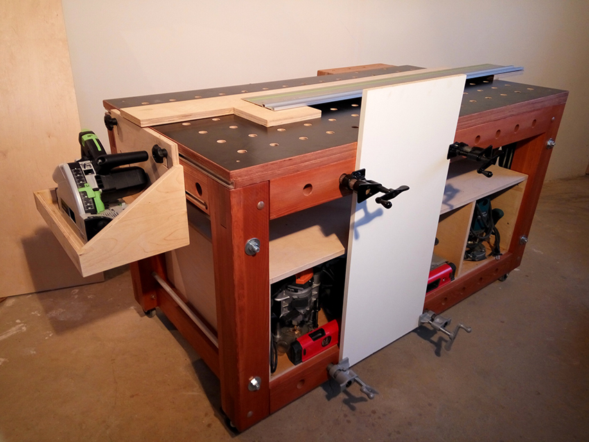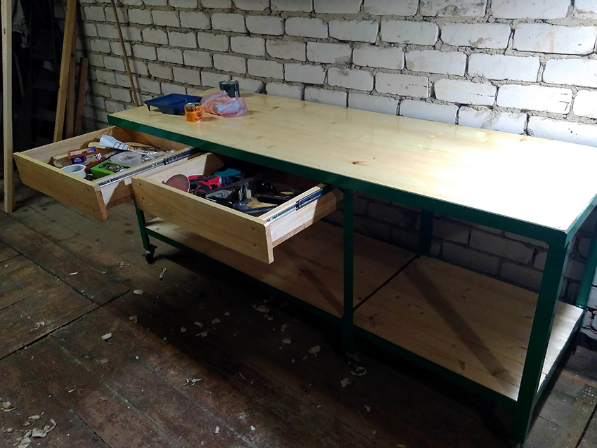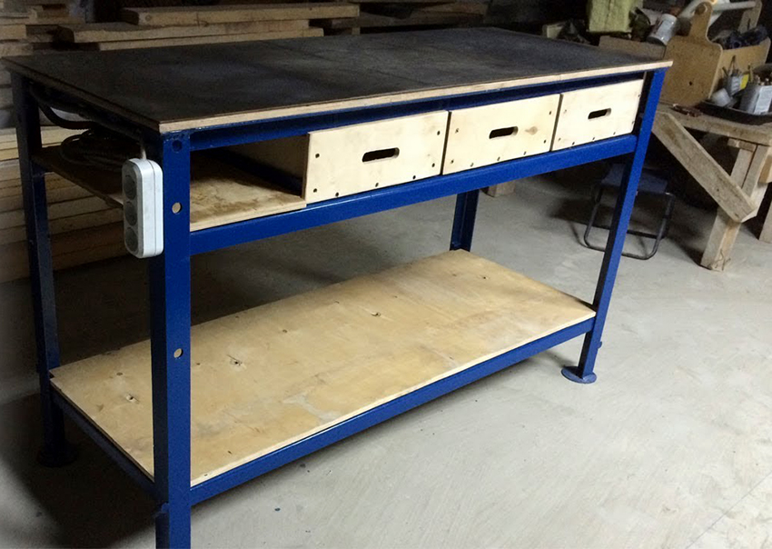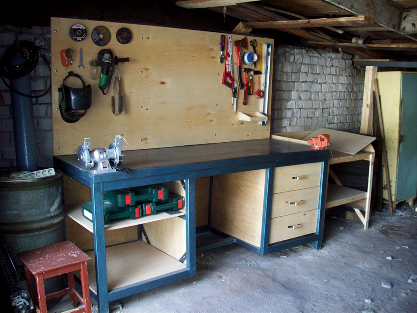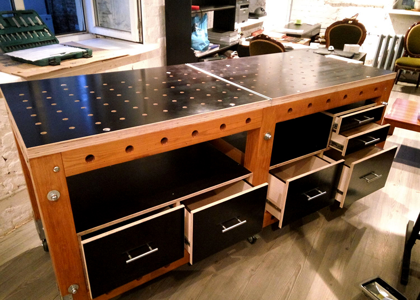 Các ngăn kéo được lắp đặt bên phải của cấu trúc để thuận tiện cho việc cất giữ các vật dụng nhỏ. Nếu bàn được sử dụng bởi một người thuận tay trái, họ nên được đặt ở phía bên kia, để mọi thứ bạn cần đều nằm trong tầm tay. Ngoài ra, bàn làm việc được trang bị một giá đỡ đặc biệt. Nó được làm từ ván ép đục lỗ và được gắn ở mặt sau của tủ. Như vậy, có thể sử dụng tối đa bề mặt của bàn làm việc và tổ chức thêm không gian lưu trữ cho các dụng cụ nhỏ làm nghề mộc.