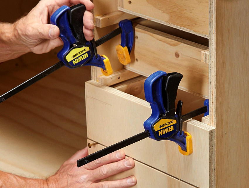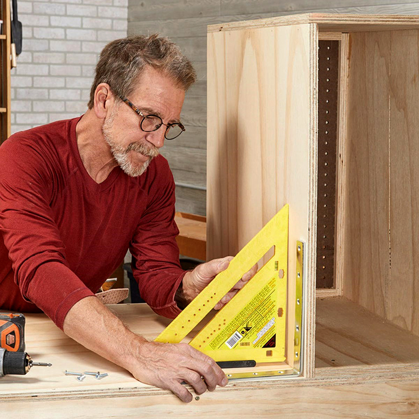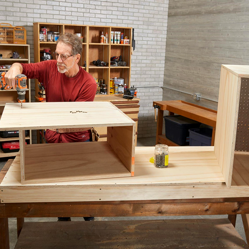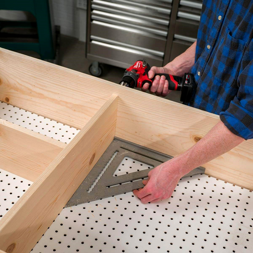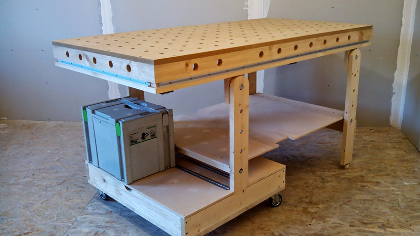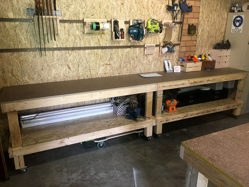 Các ngăn kéo được lắp đặt bên phải của cấu trúc để thuận tiện cho việc cất giữ các vật dụng nhỏ. Nếu bàn được sử dụng bởi một người thuận tay trái, họ nên được đặt ở phía bên kia, để mọi thứ bạn cần đều nằm trong tầm tay. Ngoài ra, bàn làm việc được trang bị một giá đỡ đặc biệt. Nó được làm từ ván ép đục lỗ và được gắn ở mặt sau của tủ. Như vậy, có thể sử dụng tối đa bề mặt của bàn làm việc và tổ chức thêm không gian lưu trữ cho các dụng cụ nhỏ làm nghề mộc.