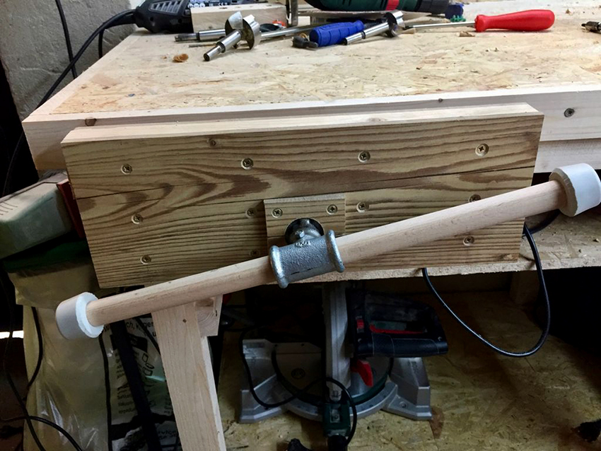 Khi hoàn tất, bạn có thể trượt thanh ren qua các lỗ trên bốn thanh thẳng đứng. Đồng thời, các đầu của nó phải nhô ra khỏi bàn làm việc khoảng 4-5 cm. Chúng được cố định (không thắt chặt) bằng khóa và vòng đệm.