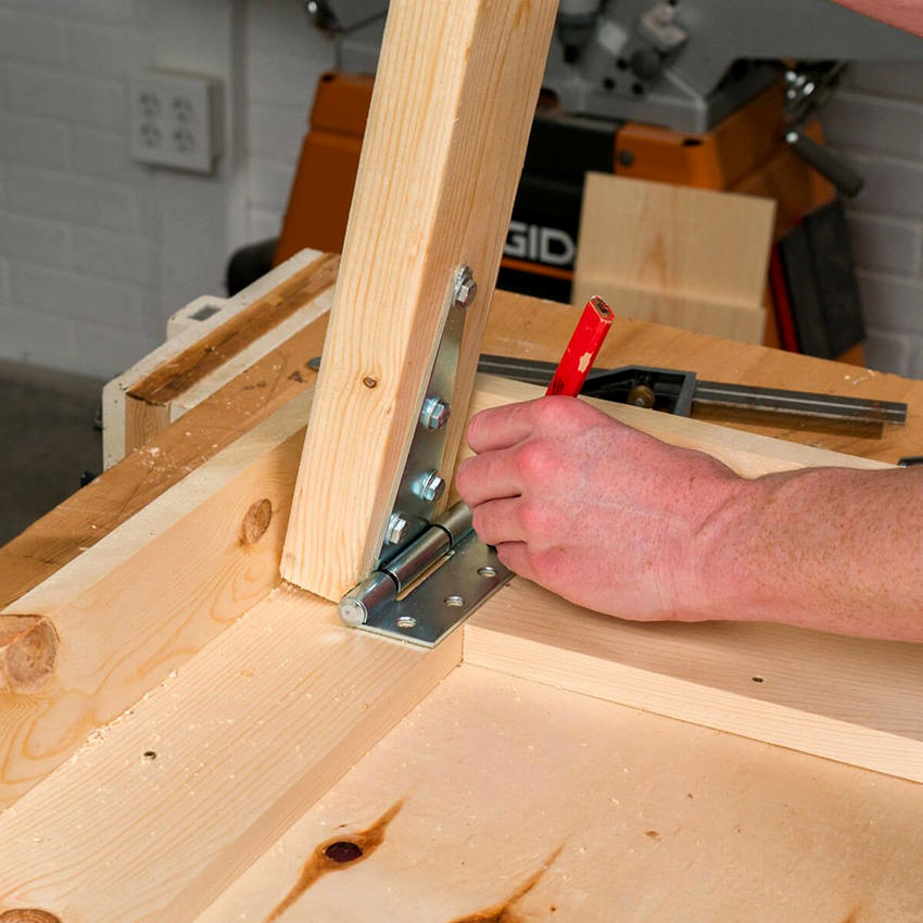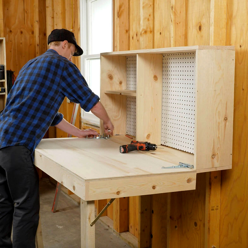 Lựa chọn thuận tiện nhất cho nhà riêng hoặc nhà để xe là thiết kế nắp có bản lề. Không giống như bàn làm việc gấp, bề mặt làm việc của nó xoay chứ không mở ra. Phương án thiết kế này có cấu trúc hoàn toàn khác, mặc dù không kém phần tiện dụng và nhỏ gọn.
