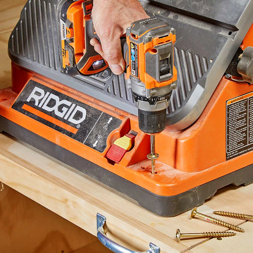 Tiếp theo, bạn cần lắp dụng cụ làm mộc lên bàn làm việc bằng tay của chính mình. Khi lắp đặt thiết bị điện trên nắp có bản lề, bắt buộc phải giữ thăng bằng. Không tải chỉ một bên hoặc một góc của bàn làm việc. Các vít định vị được làm chìm ít nhất bằng 2/3 độ dày trong phần trục của mặt bàn. Điều này cho phép bạn đạt được sự cố định đáng tin cậy, vì ván ghép điện có rất nhiều trọng lượng. Ở các khu vực bên, nơi khu vực làm việc vẫn cố định, dây buộc này có thể kéo dài qua toàn bộ độ dày của vỏ bọc.
