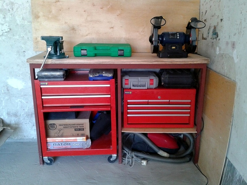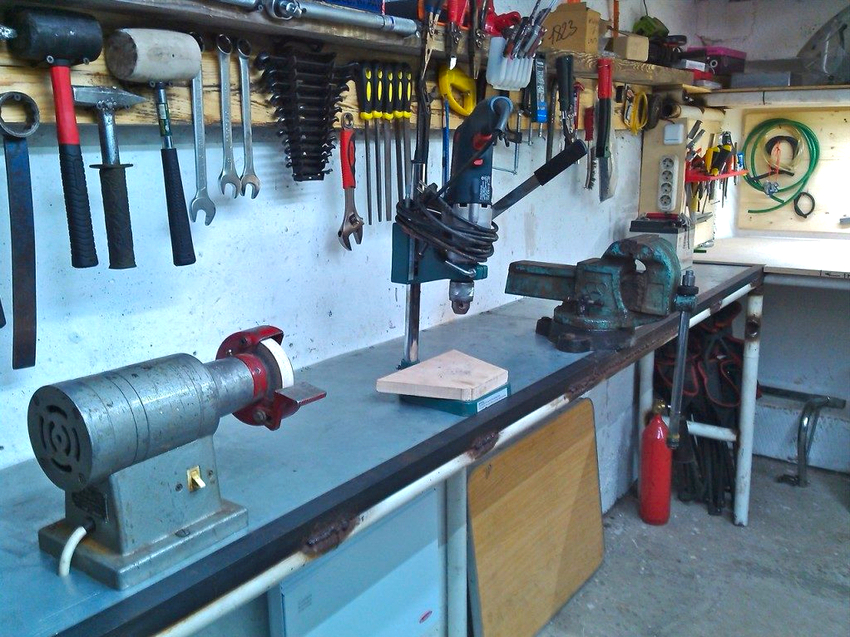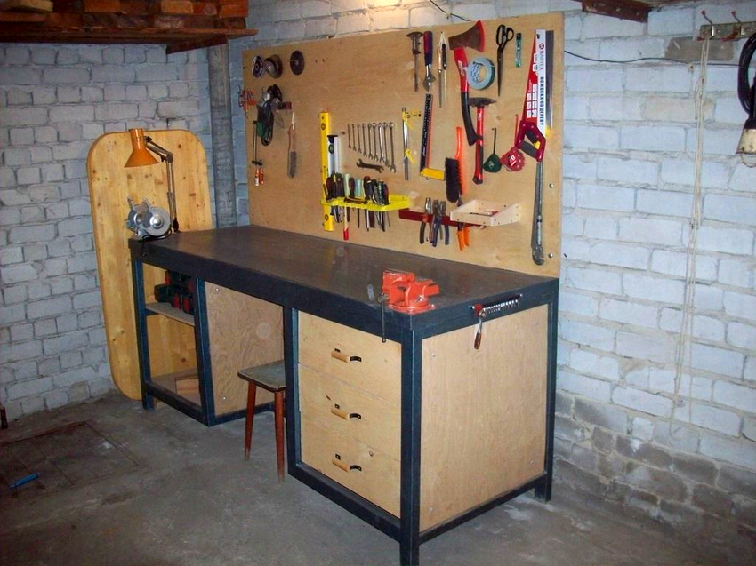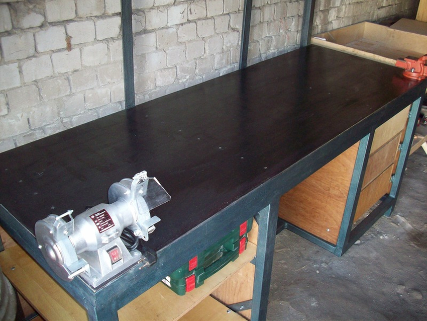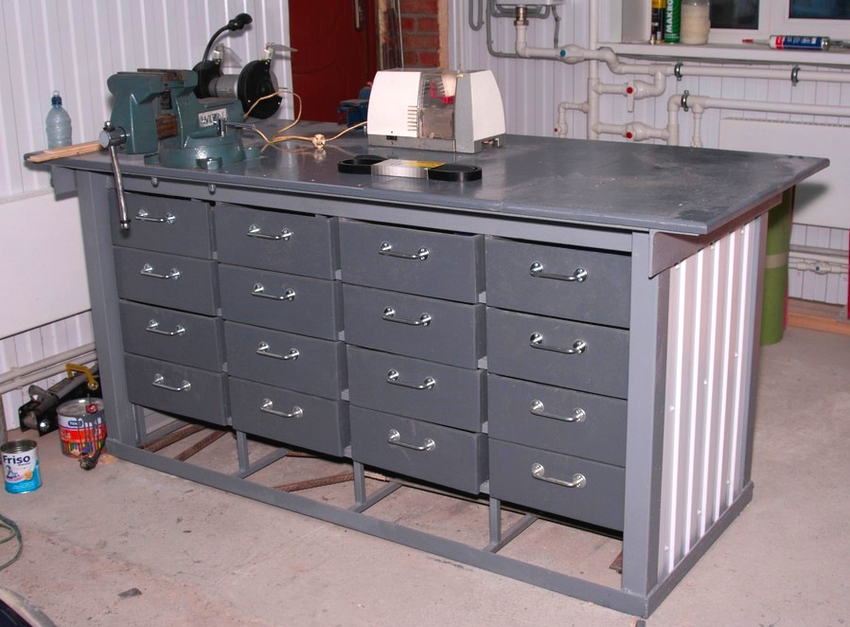 Lắp đặt một bàn thợ khóa trong nhà để xe có thể được gọi là một giải pháp phổ quát. Trong trường hợp này, bề mặt làm việc được làm bằng kim loại, do đó chủ nhân có thể làm việc an toàn với các vật liệu nặng và cứng.