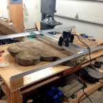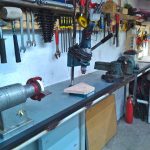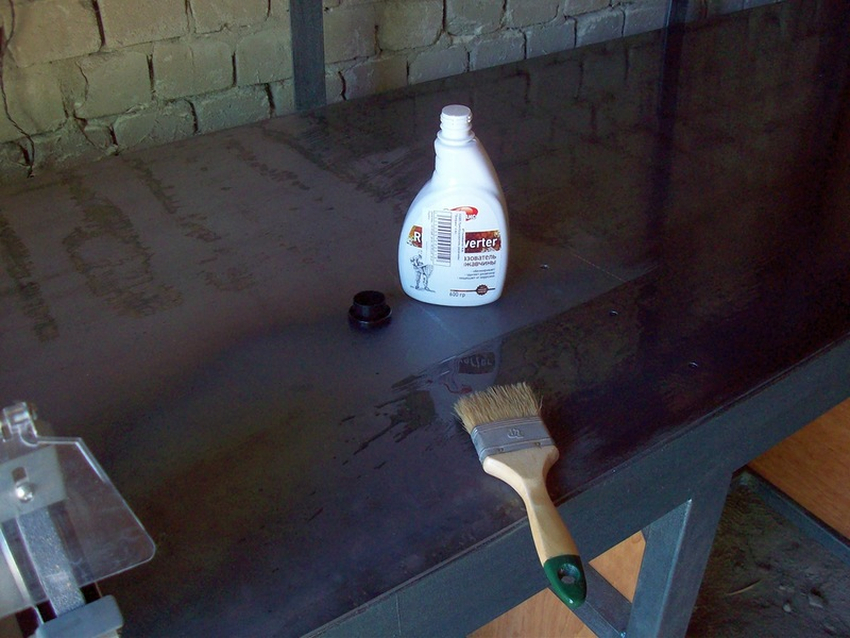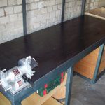 Một công cụ điện được lắp đặt ở một bên của bàn làm việc.Cạnh này của bàn làm việc nên nhô ra khỏi khung khoảng 20 - 30 cm. Nếu bề mặt làm bằng gỗ thì cần được bảo vệ bằng tấm kim loại. Thép không gỉ có độ dày 1,5-2 mm là phù hợp nhất cho những mục đích này. Mặc dù một tấm thép thông thường có độ dày 1,5 mm sẽ rẻ hơn.