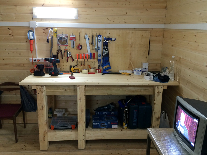 Để tạo ra một bàn làm việc tự làm trong nhà để xe bằng gỗ không đòi hỏi nhiều nỗ lực và kỹ năng xử lý máy hàn. Bộ công cụ là tối thiểu (máy khoan và ghép hình điện), và bản thân quá trình này mất ít thời gian hơn nhiều so với việc tạo ra một cấu trúc kim loại.