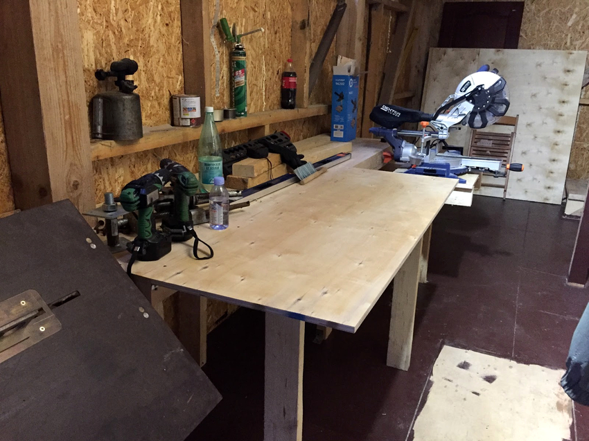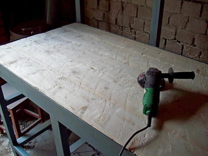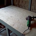Khi phần khung đã sẵn sàng, bề mặt làm việc được lắp ráp từ các tấm ván và một tấm ván ép. Tấm bạt kết quả được điều chỉnh theo kích thước của bàn làm việc, san phẳng và xử lý bằng keo dán gỗ. Sau khi sấy khô hoàn toàn, nó được cố định chắc chắn trên khung bằng vít tự khai thác.