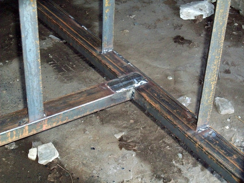 Sau đó, các thành viên chéo được thực hiện. Chúng được hàn theo chiều ngang ở phía dưới trên các chân đỡ. Để tăng cường kết cấu, một thanh giằng chéo nên được lắp vào mặt sau của bàn. Dưới các hộp, có thể được làm từ bất kỳ vật liệu có sẵn nào, bạn cần hàn các phần ngang và các góc dọc.