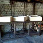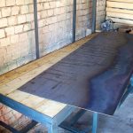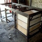 Để tăng cường cấu trúc, các miếng đệm bằng gỗ được lắp đặt ở phần trên và phần dưới giữa các chân. Những chiếc thấp hơn, nằm ở độ cao 15 cm so với mặt sàn, có thể được sử dụng làm chân đế cho kệ. Để lắp ráp mặt bàn, một tấm ván có rãnh bào làm bằng gỗ sồi hoặc gỗ sồi là phù hợp. Bạn cũng có thể sử dụng một vài tấm ván ép chịu ẩm dày 1,8 cm được dán lại với nhau và cắt viền xung quanh.