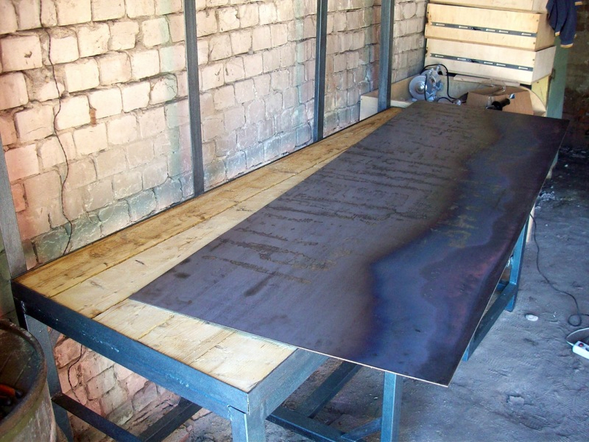 Nếu bậc thầy có máy hàn bán tự động trong tay, bạn có thể kết nối trước các phôi kim loại của bàn. Sau đó, một tấm thép được cố định trên chúng. Trong trường hợp này, hàn điểm là bắt buộc. Nếu bạn sử dụng công nghệ tiêu chuẩn khi kết nối bề mặt làm việc với khung kim loại, thì khả năng cao sẽ xảy ra hiện tượng quá nhiệt và làm hỏng tấm. Do đó, sóng có thể xuất hiện trên bề mặt của quầy, gây bất tiện trong quá trình làm việc.
