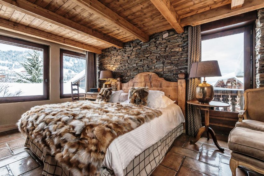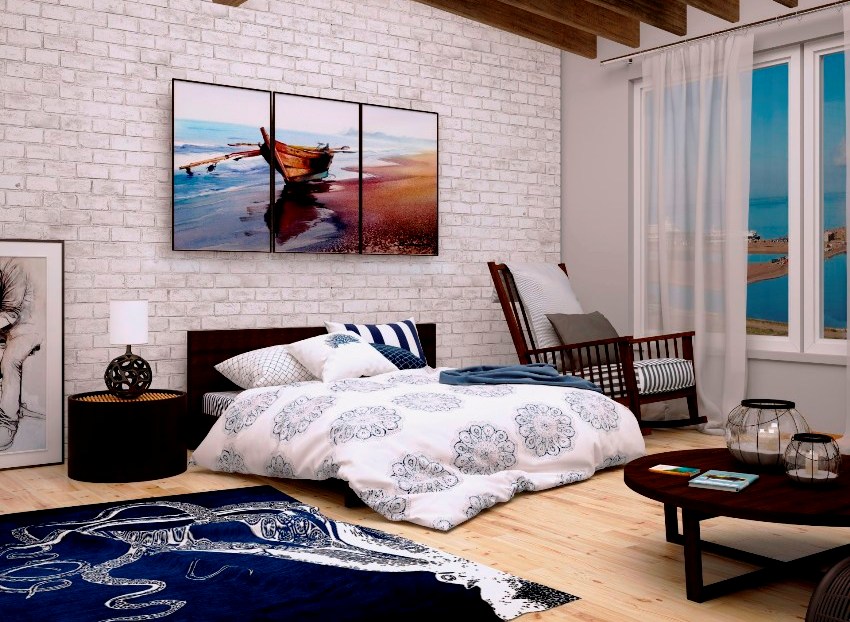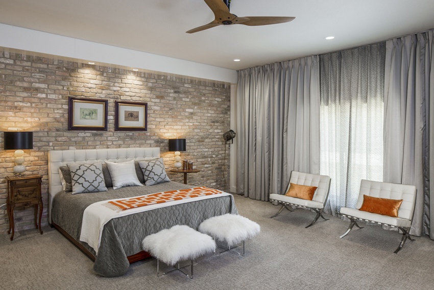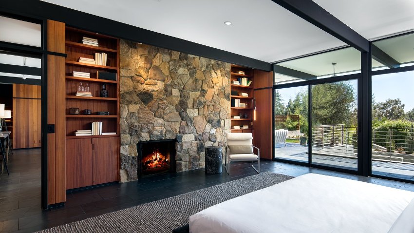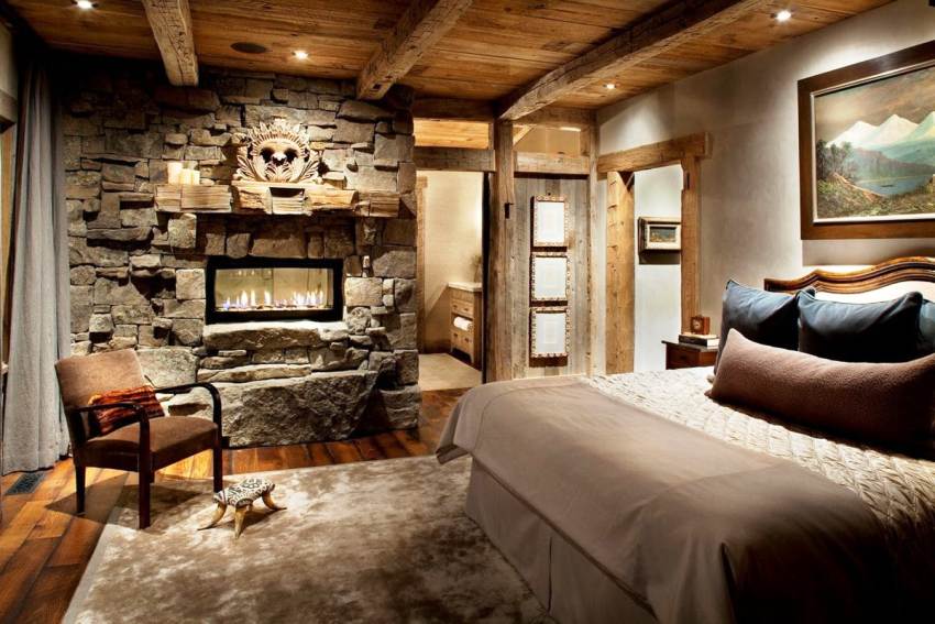 Việc sử dụng đá trong phòng ngủ là cần thiết, vì phòng này cần giữ được ánh sáng, rộng rãi và thoáng mát. Việc ốp từng mảng tường bằng đá tối màu sẽ tạo điểm nhấn tươi sáng cho căn phòng. Màu sắc tự nhiên và kết cấu tạo cho nội thất một nét Địa Trung Hải, mộc mạc và dân tộc.