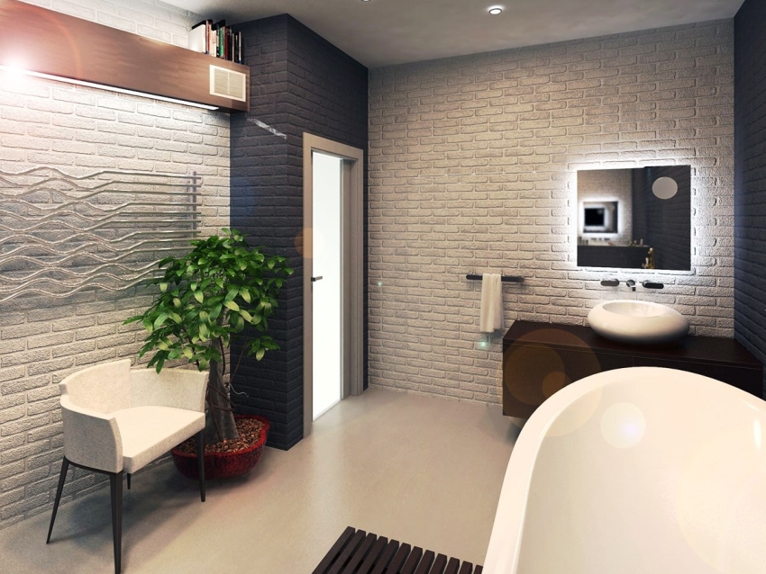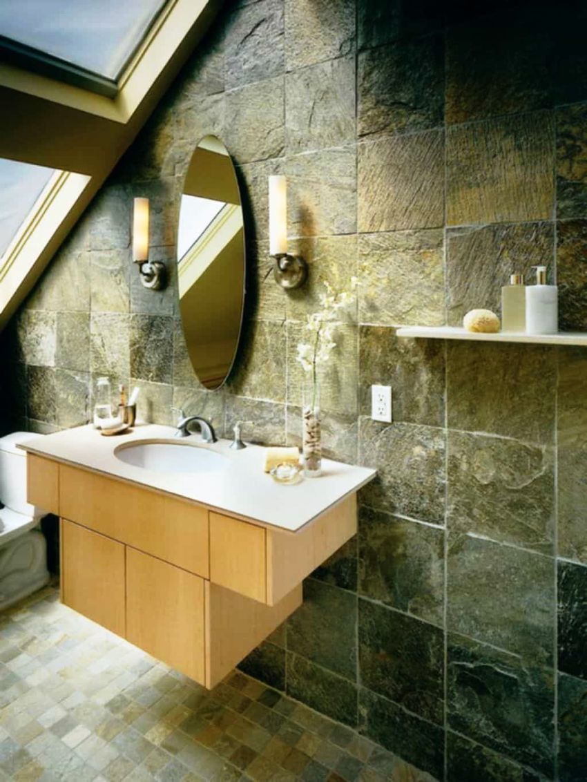 Phòng tắm cũng không ngoại lệ khi sử dụng đá trang trí. Hạn chế duy nhất là không sử dụng vật liệu cấu trúc xốp. Những viên đá này sẽ không hấp thụ hơi nước và độ ẩm. Tốt hơn là chọn một vật liệu bền và không trơn trượt.Đối với phòng tắm, gạch đá phủ men, đồ đá sứ, đá acrylic và polyester là phù hợp nhất. Sàn phòng tắm có thể được làm bằng đá cẩm thạch, loại đá bay hơi nhanh, hoặc lát gạch có hoa văn ván gỗ. Đá phiến phù hợp cho các bức tường. Đừng chọn đá sa thạch. Dưới tác động của hơi ẩm, nó nhanh chóng bị mất màu, trong những phòng tắm nhỏ, bạn không nên phủ hoàn toàn tất cả các bức tường. Điều này sẽ dẫn đến thực tế là ngay cả khi không có điều này, một căn phòng nhỏ sẽ có vẻ nhỏ xíu.