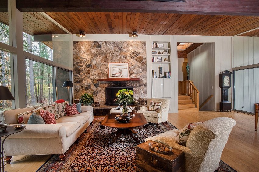 Thiết kế phòng theo phong cách sinh thái liên quan đến việc sử dụng đá cuội đánh bóng hoặc đá cuội màu biển. Một viên đá trang trí trên tường trong phòng khách sau ghế bành hoặc xung quanh lò sưởi trông thật ngoạn mục. Một tấm ốp như vậy sẽ truyền nhiệt tốt nhất của lò sưởi đang hoạt động ra không gian xung quanh. Bạn có thể thay thế một ngọn lửa trực tiếp bằng một lò sưởi điện hoặc một hốc cho nến. Bạn có thể lát đá cả một phần tường và toàn bộ khe hở.