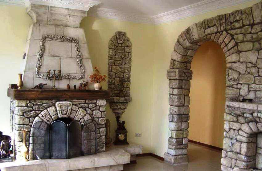 Thông thường, trang trí nội thất bằng đá nhân tạo được thực hiện chính xác trên nền bê tông, vì loại vật liệu này có khả năng trang trí rộng và phương pháp sản xuất tương đối đơn giản