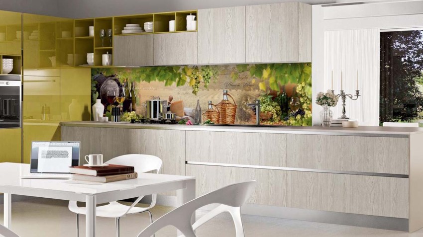 Khả năng in ảnh trên bảng sợi gỗ cho phép bạn có được một nội thất đẹp và phong cách bằng cách sử dụng các tấm tường cho nhà bếp. Tạp dề MDF thường được sản xuất với các bản vẽ trừu tượng, chủ đề bảng và tĩnh vật.