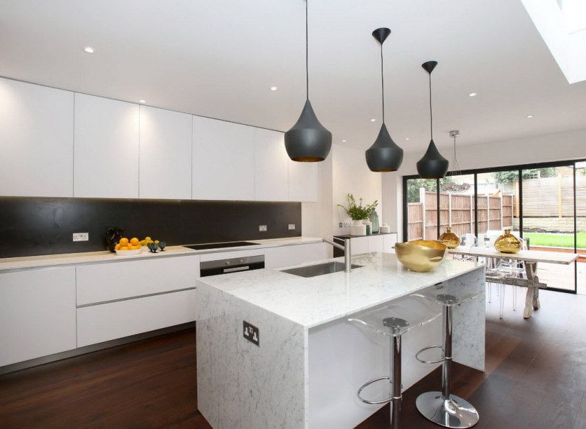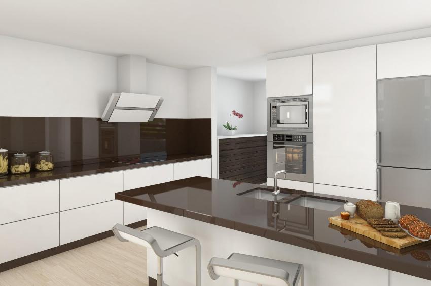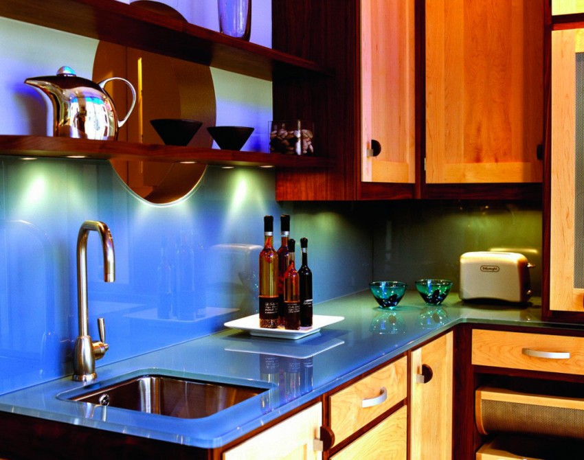 Một tấm kính phía trên bếp nấu và bề mặt làm việc sẽ tăng thêm sự sang trọng và độc đáo cho nội thất nhà bếp hiện đại