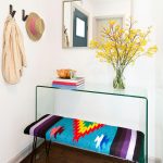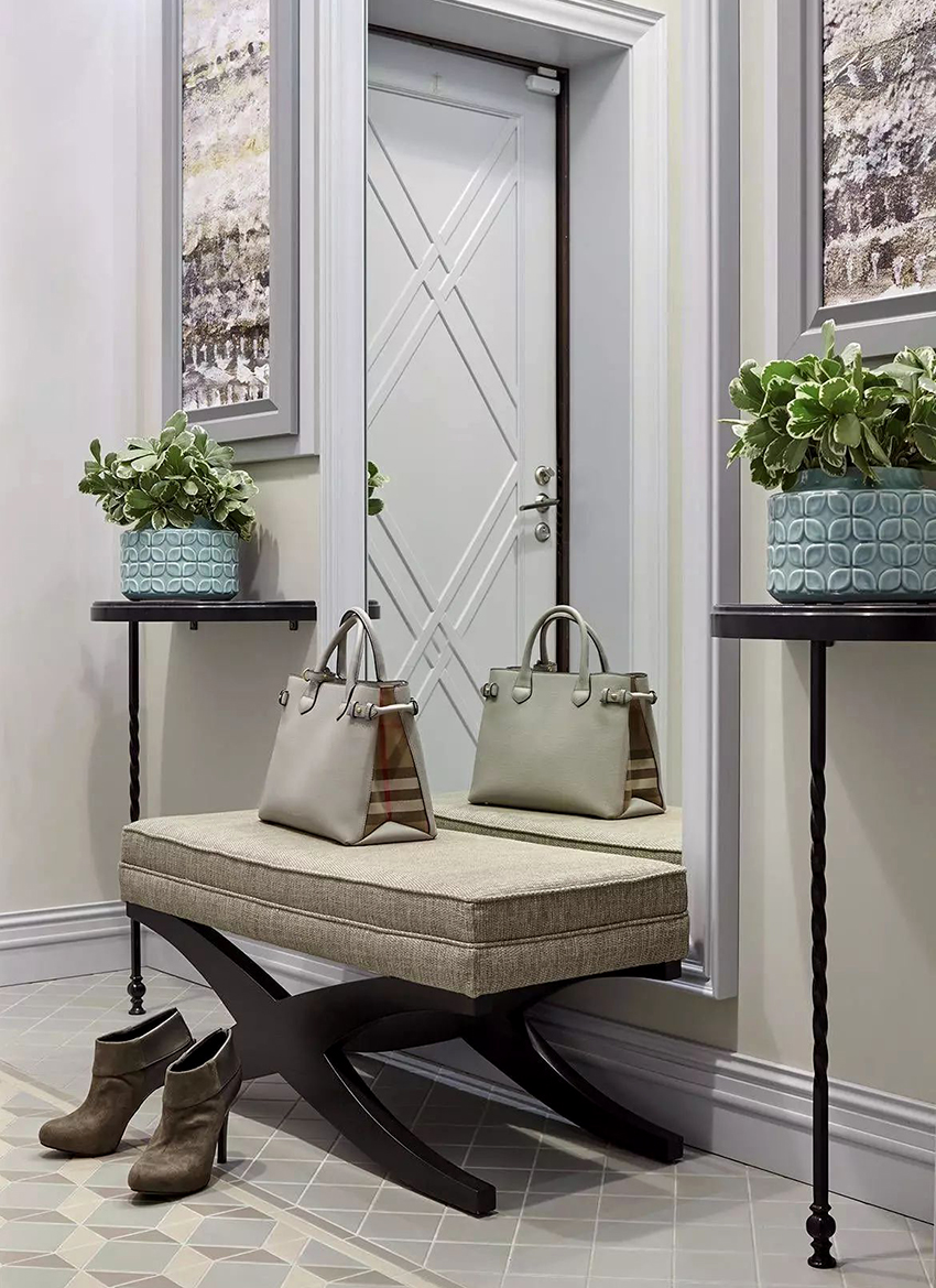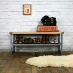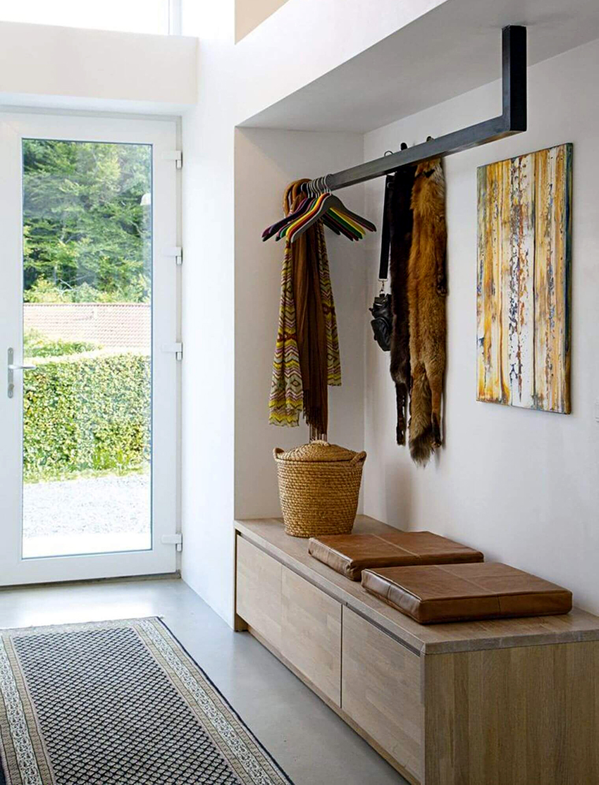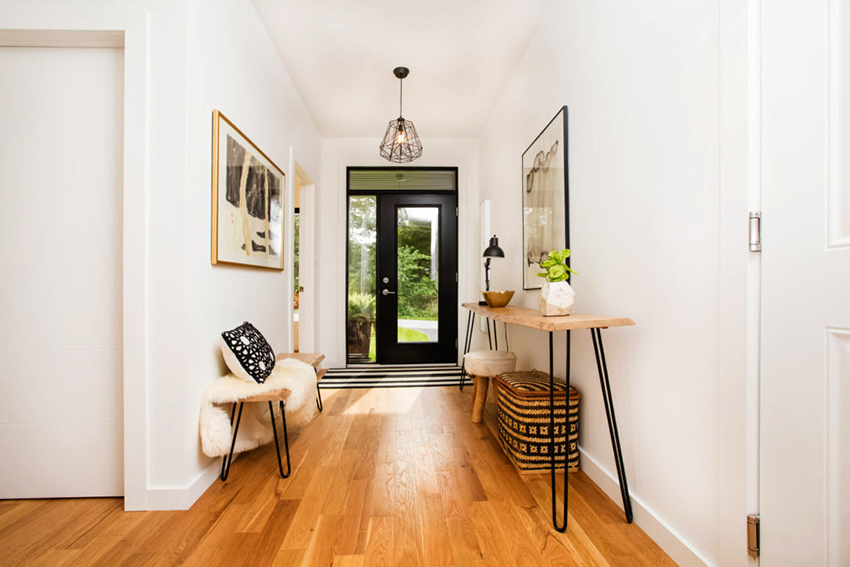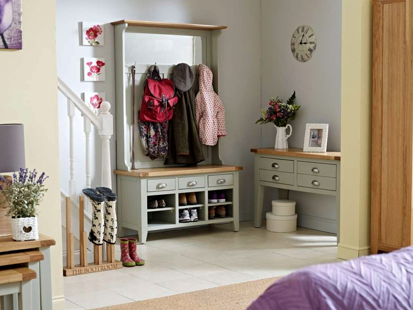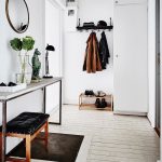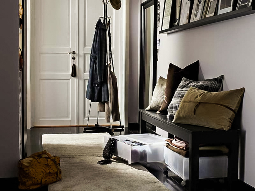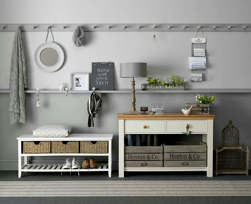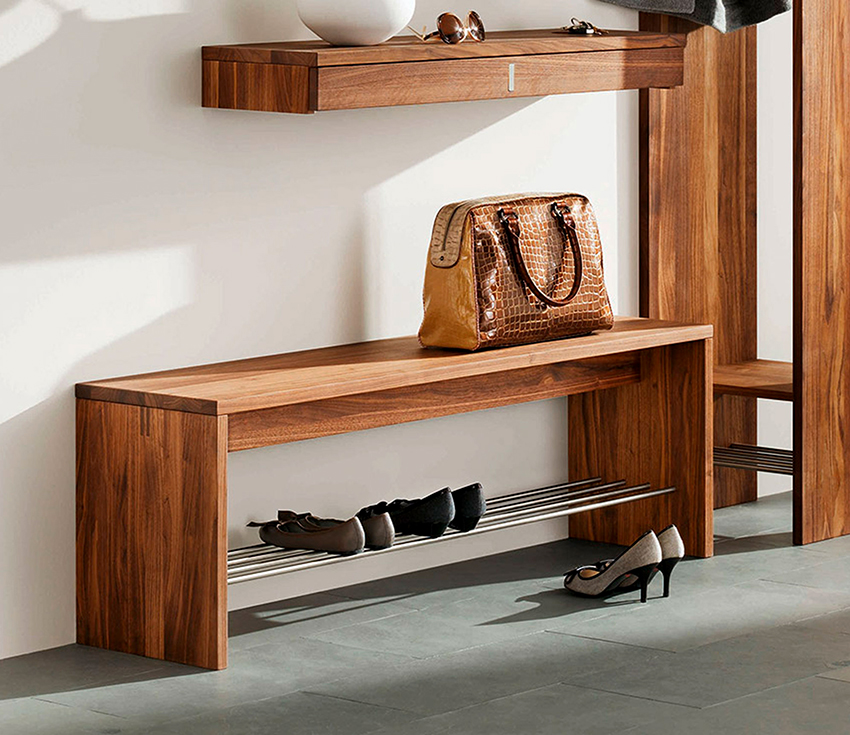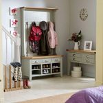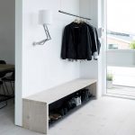 Bàn tiệc ở hành lang với chỗ ngồi và giá để điện thoại hoặc máy tính bảng là phù hợp nhất cho một người hiện đại. Một giải pháp nhỏ gọn và thiết thực là sản phẩm có giá để giày. Cấu tạo gồm một băng ghế dài, bên dưới có giá để giày dép dạng kệ mở hoặc trang bị cánh cửa bản lề đóng giá treo mini. Lựa chọn đầu tiên phù hợp với những hành lang hẹp. Bạn cũng có thể chọn mẫu có kệ giày gấp hiện đại.
