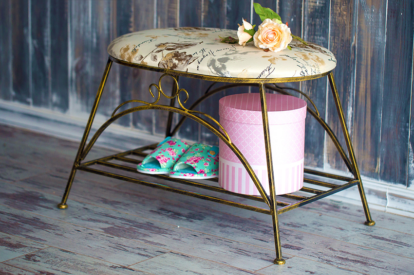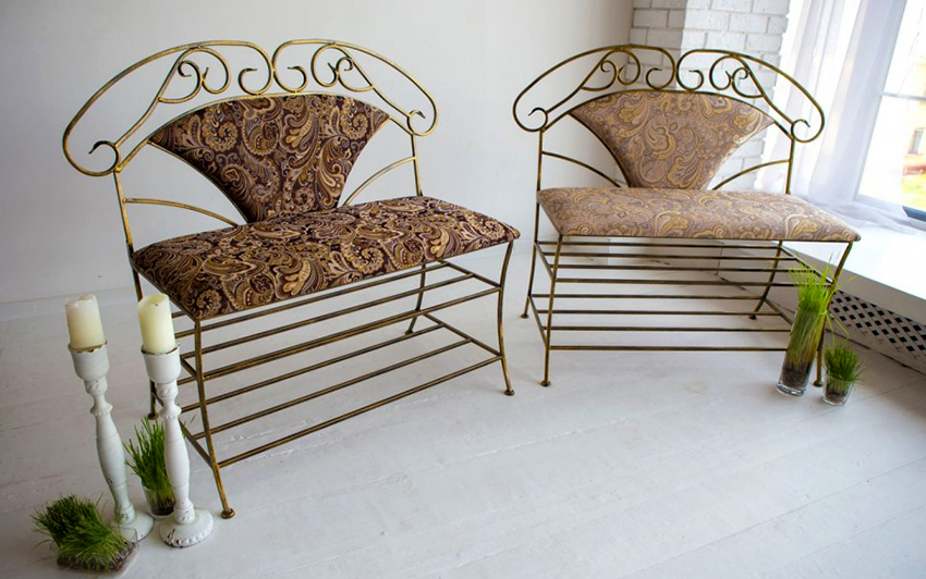 Một mô hình thú vị và đáng yêu khác là băng ghế "Mebelik". Sản phẩm được làm bằng một thanh kim loại uốn cong. Dưới ghế cứng có hai kệ lưới dốc để cất giày. Mô hình có thể được bổ sung với một mặt sau rèn, mang lại cho nó một vẻ ngoài hiệu quả và phong cách hơn.