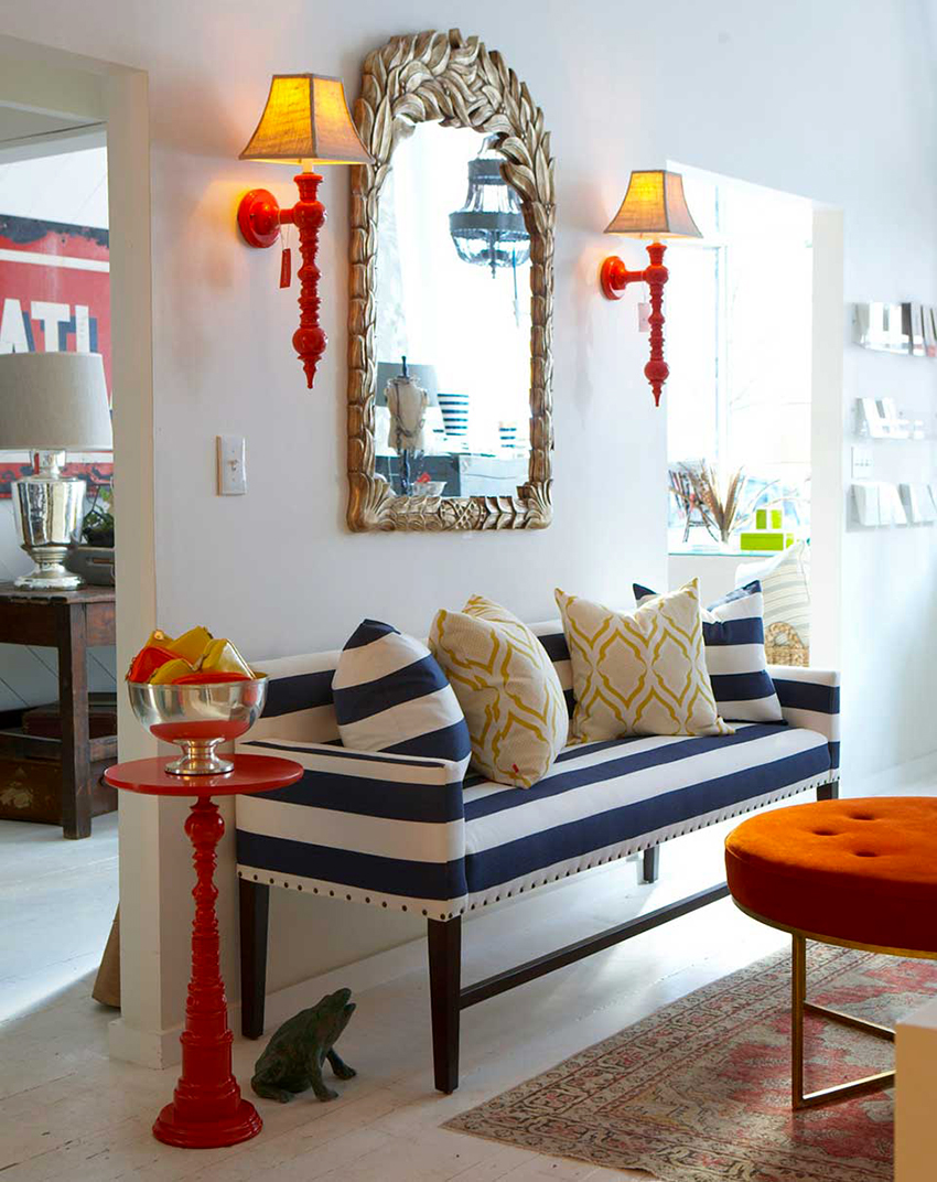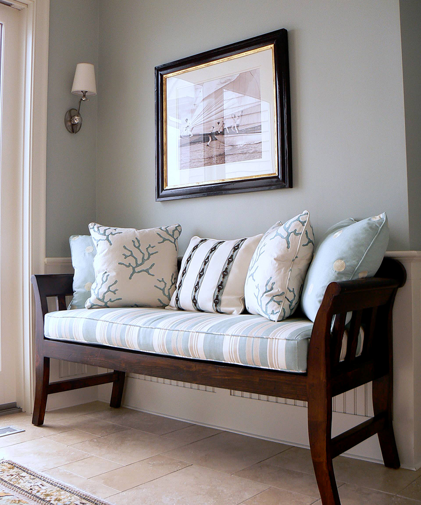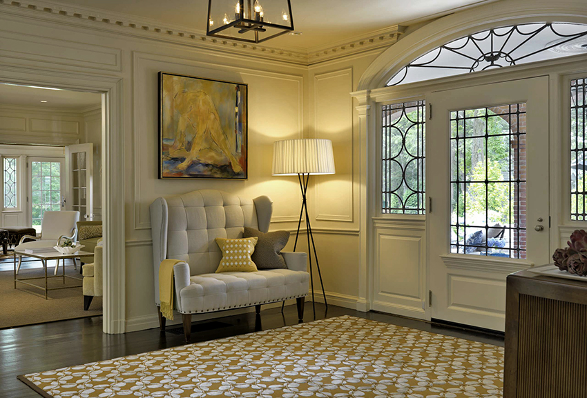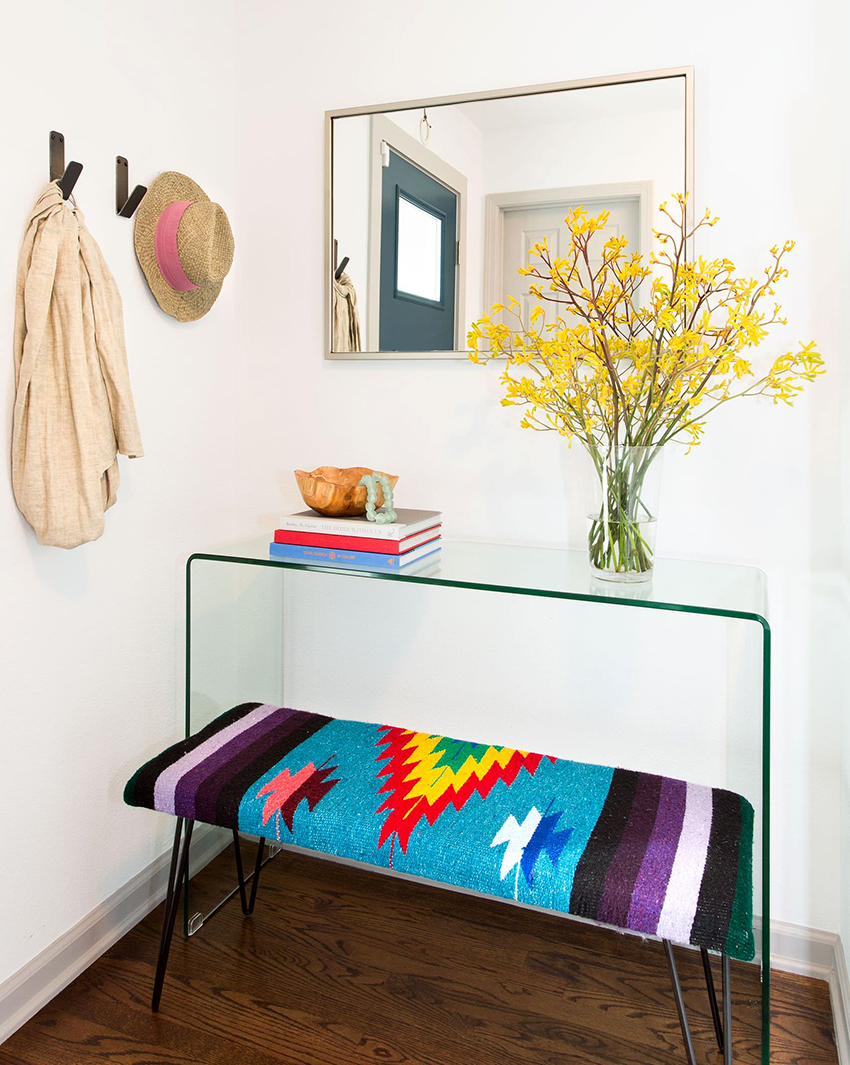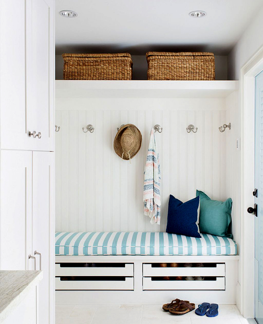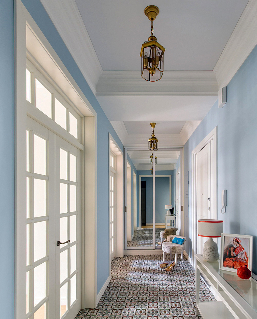 Thiết thực nhất là sản phẩm có vải bọc tối màu.Tuy nhiên, một chiếc ghế dài màu trắng ở hành lang sẽ tạo thêm sự ấm cúng trong phòng, mở rộng nó về mặt thị giác. Nó trông sẽ bớt cồng kềnh hơn, rất hữu ích cho những hành lang nhỏ.