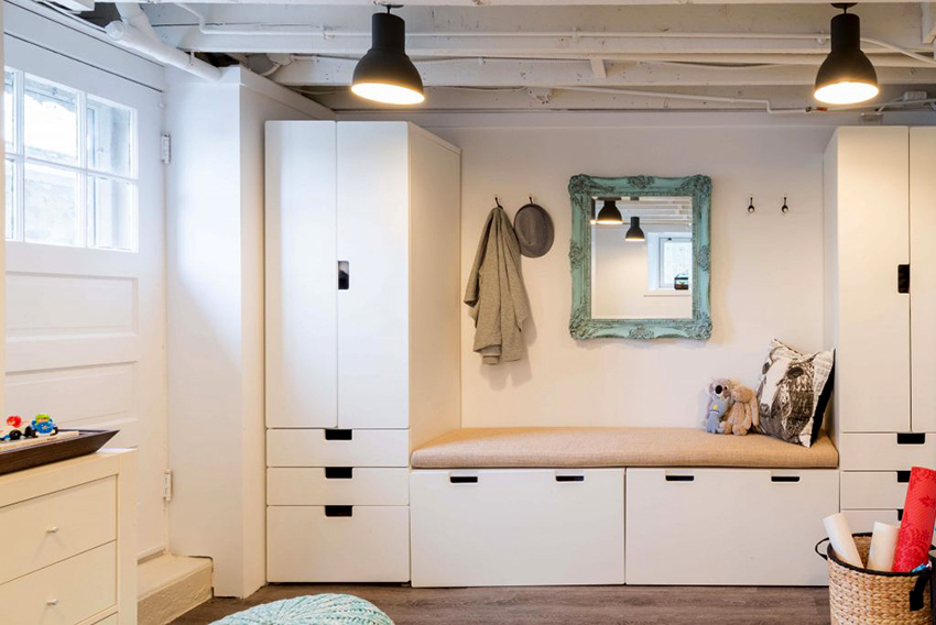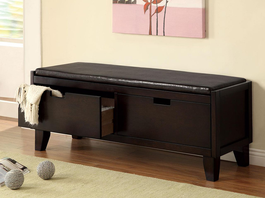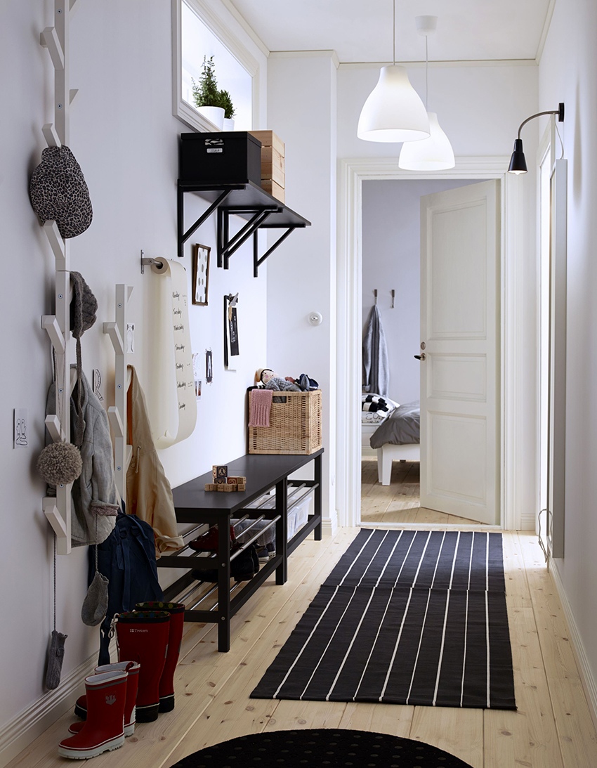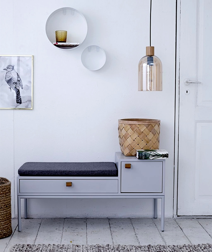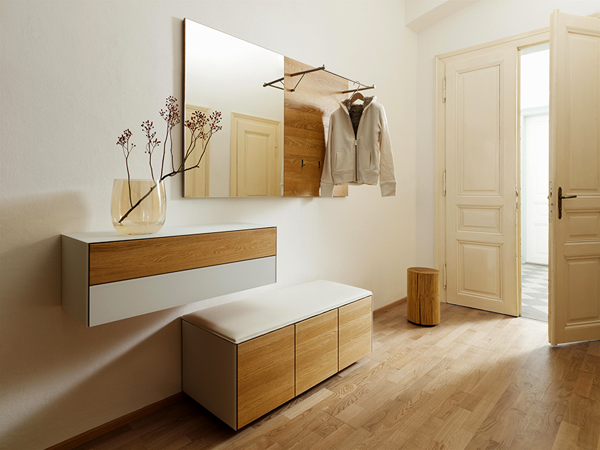 Đối với hành lang dài, một mẫu hẹp với một ngăn kéo dài dưới chỗ ngồi là một giải pháp tốt. Rất tiện lợi để cất ô dù ở đây. Ngoài ra, sản phẩm có thể được trang bị ngăn kéo bản lề và tủ phụ.