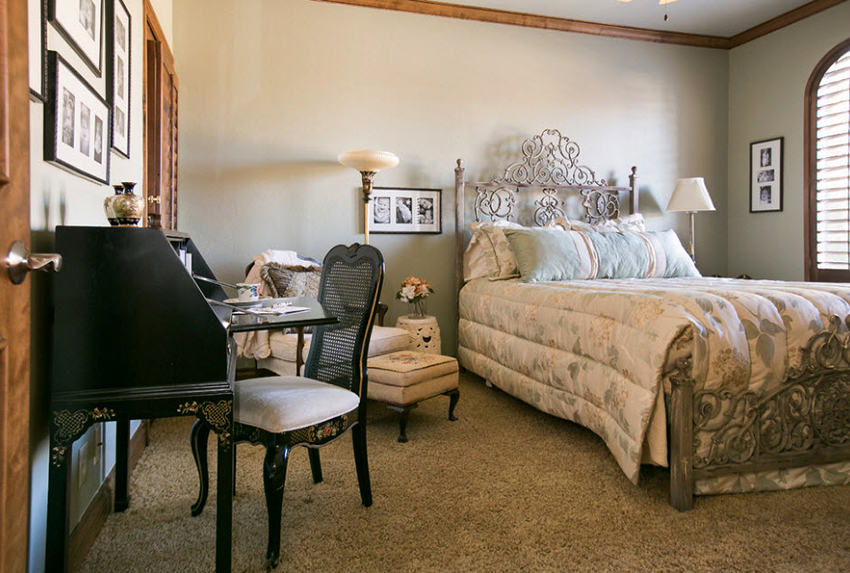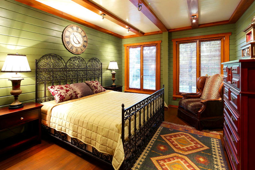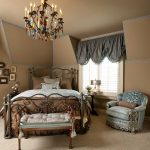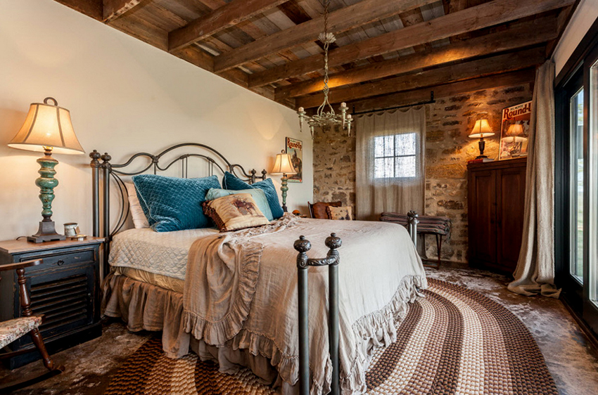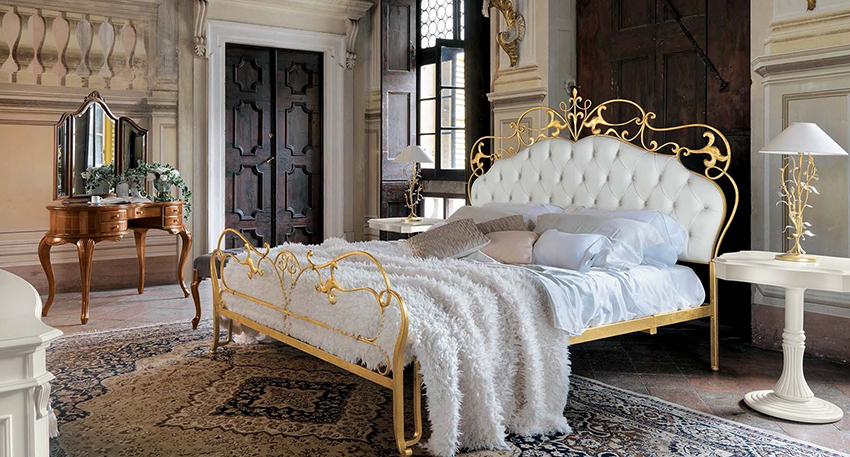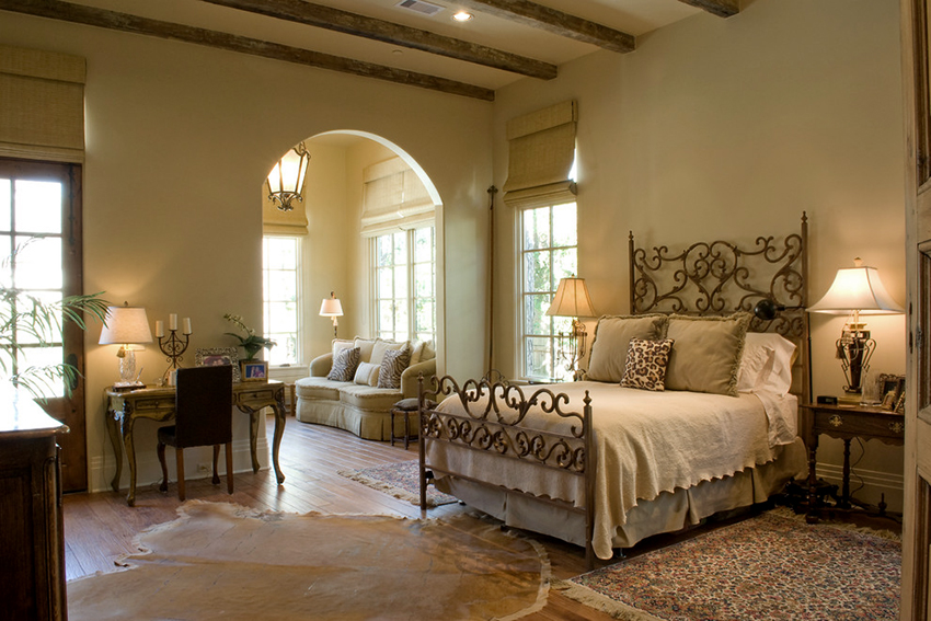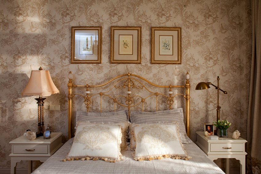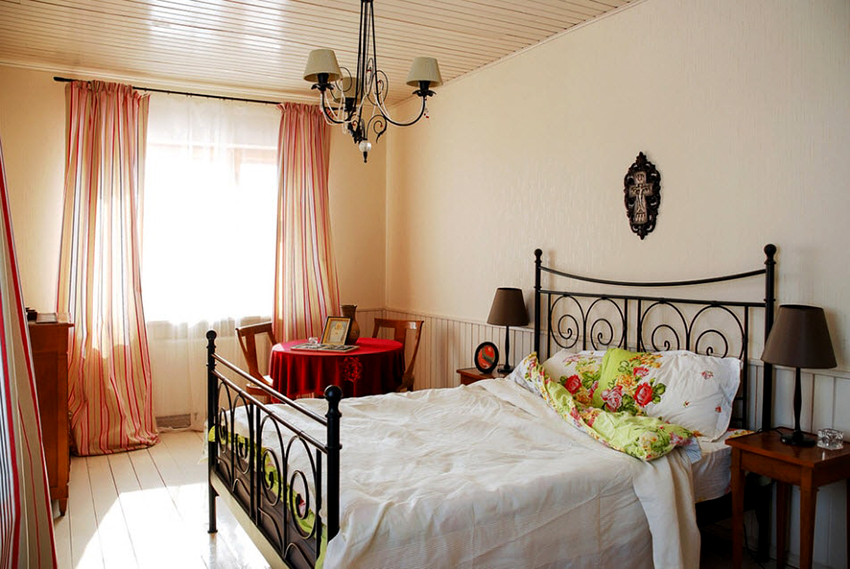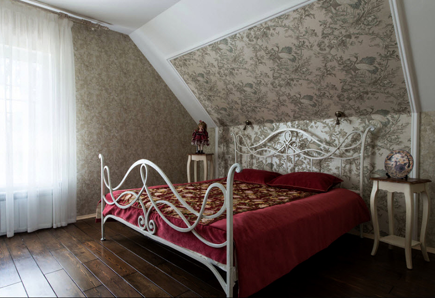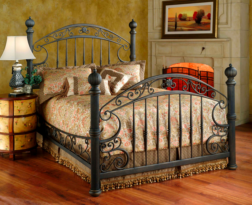 Thông thường, một phiên bản cổ điển được lắp đặt trong phòng ngủ - một chiếc giường đôi bằng sắt rèn có màu tối. Nó nên được bổ sung bằng các sản phẩm làm từ vải lụa nhẹ với sắc thái nhẹ. Nên sử dụng những chiếc gối có kích thước nhỏ, đơn sắc, không có họa tiết. Nhà kho sáng, công việc mở sẽ làm dịu các đường tối nghiêm ngặt.