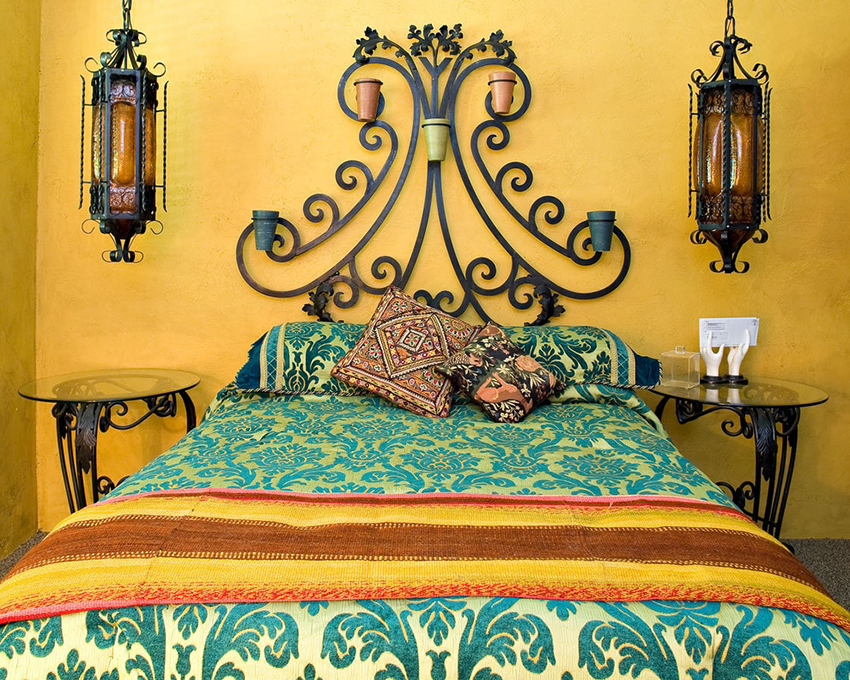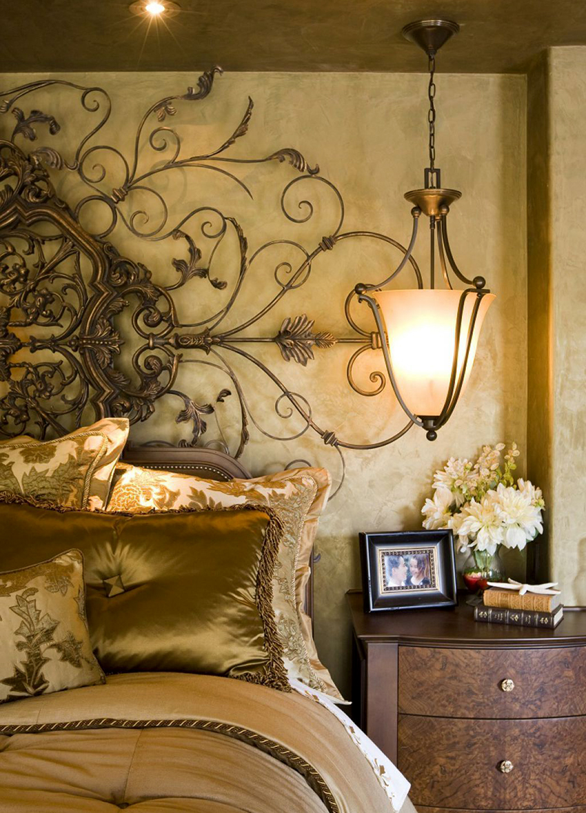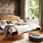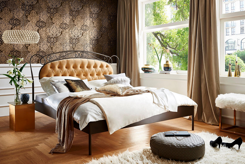 Nếu tính trang trí, thể hiện phong cách là điều tối quan trọng, thì bạn nên chọn một chiếc giường có lưng sắt không bọc nệm êm ái. Các yếu tố rèn mở của đầu giường sẽ thiết lập giai điệu, mang lại sự lãng mạn, hạn chế, tinh tế, nhẹ nhàng, hoặc ngược lại, sự vững chắc (tùy thuộc vào phong cách được chọn) vào không gian phòng ngủ.