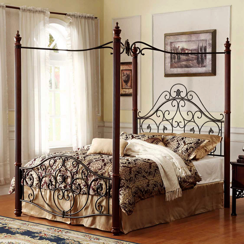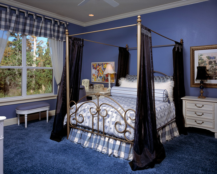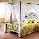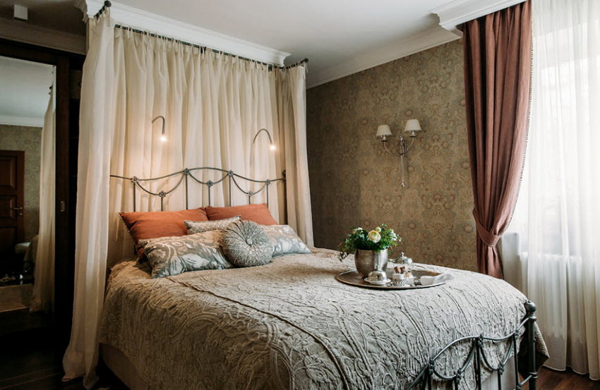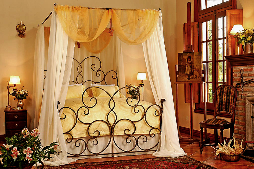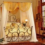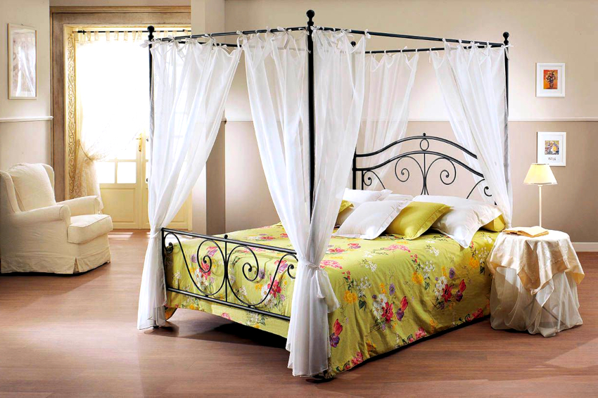 Một loại đồ nội thất đặc biệt - rèn giường có màn che... Cô ấy tạo ra một bầu không khí lãng mạn trong phòng ngủ. Tốt hơn là nên lắp đặt một sản phẩm như vậy trong các phòng có trần cao và tường sáng. Điều cần thiết là cách tiếp cận là miễn phí, do đó, hoặc phòng ngủ phải lớn hoặc tối thiểu phải có thêm đồ nội thất.