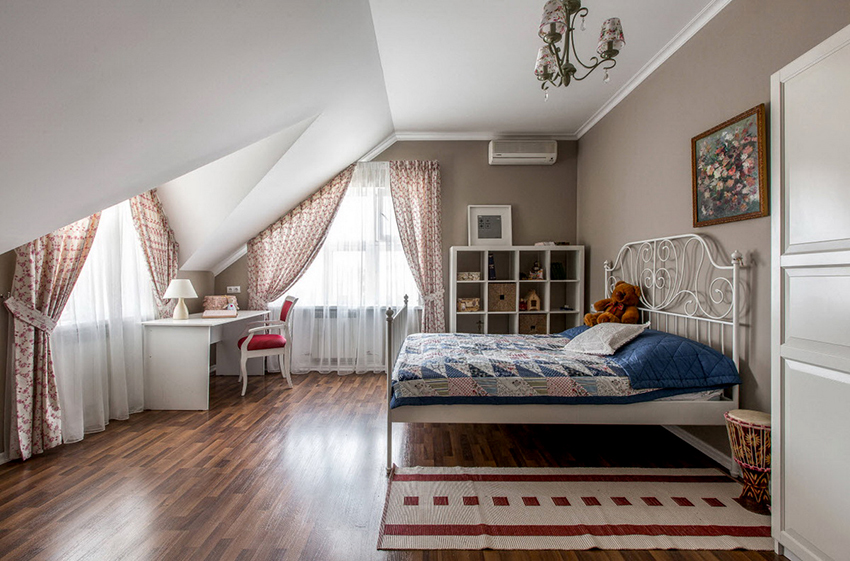 Trong những căn phòng nhỏ, giường gác xép bằng kim loại có thể là lựa chọn tốt nhất. Phần trên (trực tiếp là giường) nằm ở độ cao 120-150 cm so với mặt sàn, dưới đó họ trang bị một khu vực cho trò chơi, bàn làm việc hoặc kệ, tủ. Một chiếc thang được dùng để leo lên chỗ ngủ. Giường có đệm.